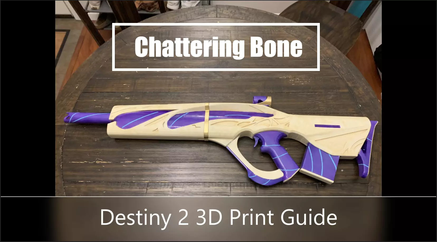 This set contains the 3D printing files to create a replica of Chattering Bone; from Destiny 2. This part is designed in multiple parts for easy printing. All of the pieces are scaled to fit on an Ender 3 V2; which is what I printed mine on.