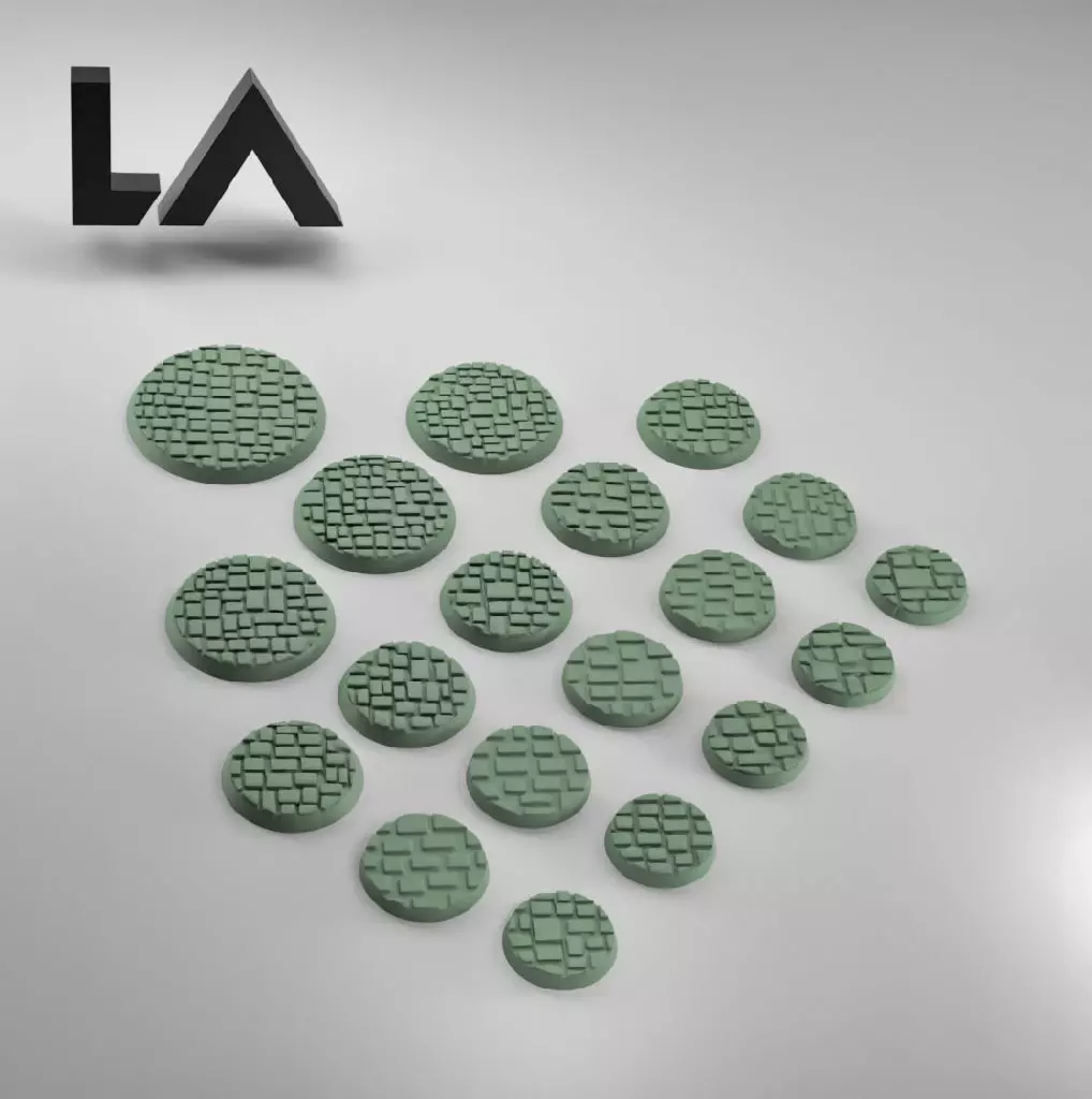 A set of the most common bases sizes for table top war gaming with a custom made cobblestone pattern.