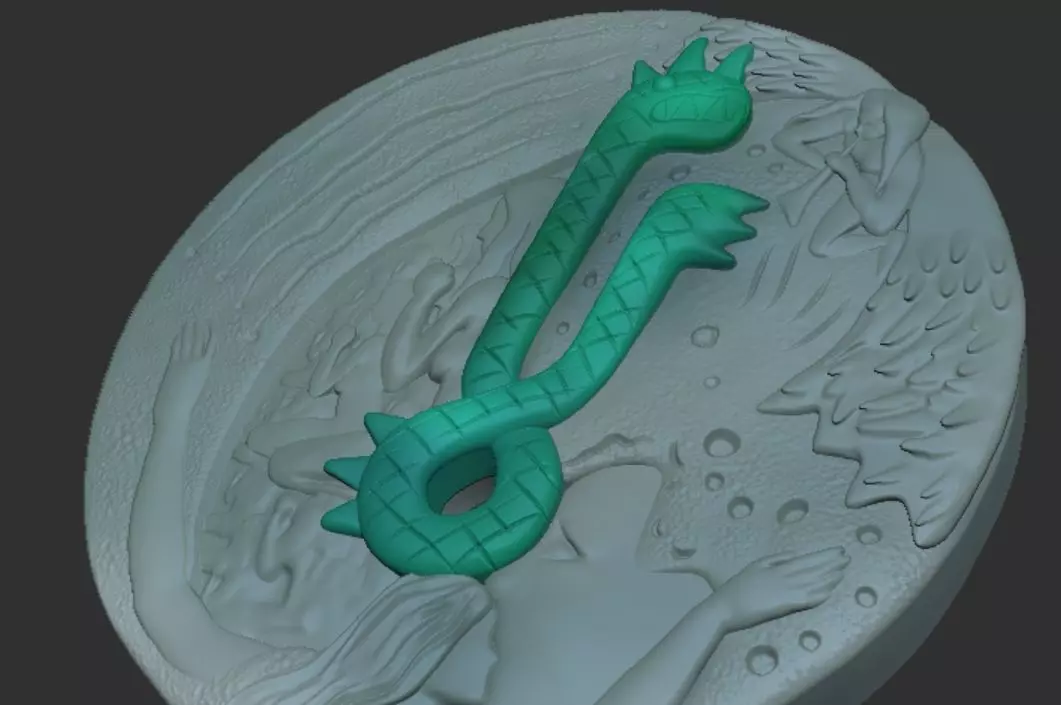 The relic takes the appearance of a circular relief that contains four fragments, each representing one of the four clans that united against the Demon Clan, with the Dragon Handle placed in the center.