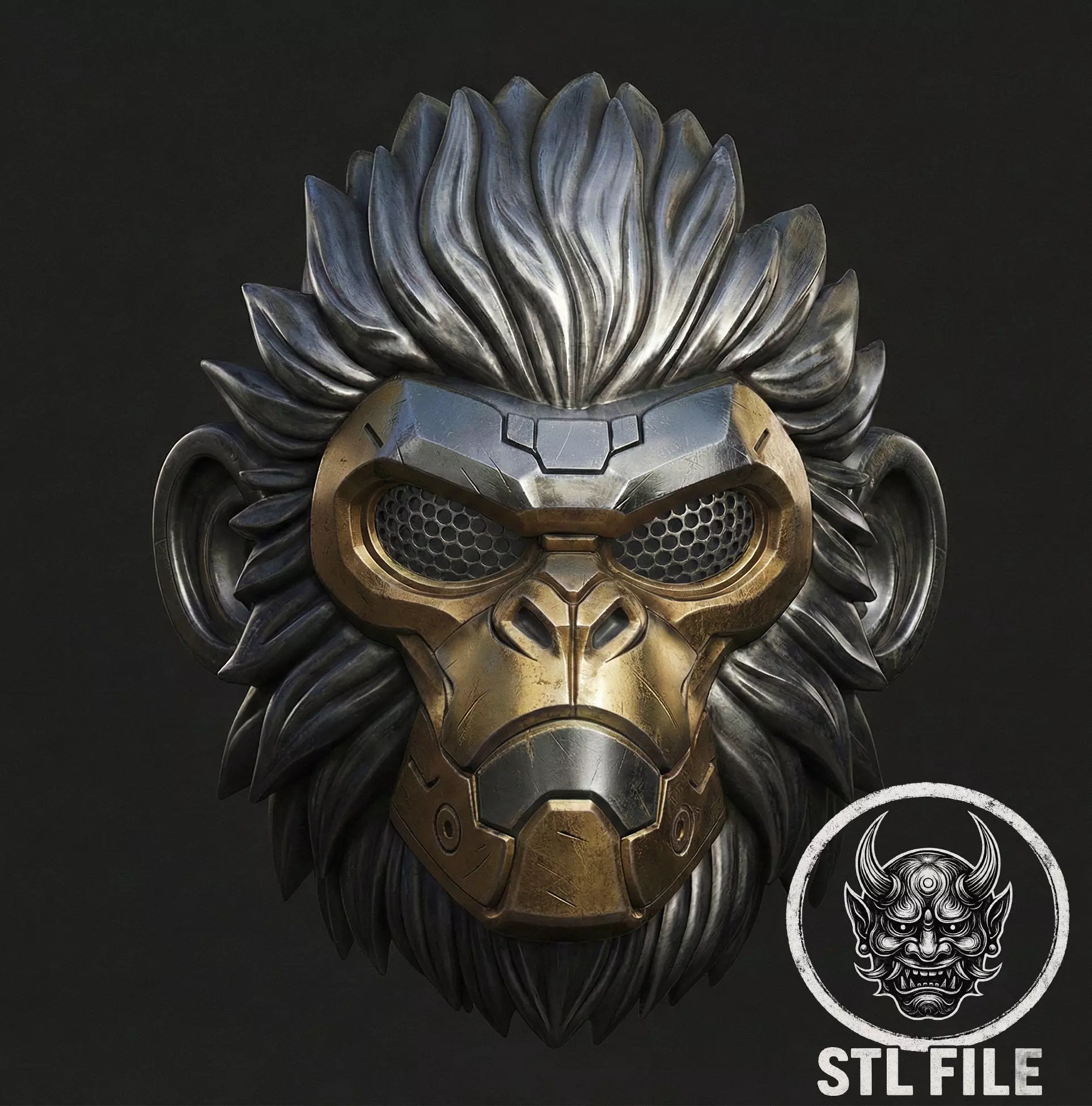 Cyber Primate Mask is a highly detailed futuristic monkey mask designed for 3D printing.This model blends organic primate anatomy with advanced mechanical and cyberpunk elements, creating a powerful sci-fi character perfect for cosplay, props, display pieces, or collectible helmets.The aggressive metallic look and layered surface details make this mask ideal for painting, weathering, and customization.Features :High-detail sci-fi / cyberpunk designFuturistic robotic primate aestheticOptimized for FDM and resin 3D printingIdeal for cosplay, props, helmets, display, or decor.Looks great with metallic or weathered paint finishesWhat You’ll Receive:STL file(s) for 3D printingDigital download only (no physical item)Printing Recommendations:Recommended materials: PLA, PETG, ABS, or ResinScaleable to fit your needs.Supports may be required depending on printer and settingsFile Information:STL formatDigital download only — no physical item includedMask is sized for a standard adult's head..This allows for cleaner prints, reduced support material, and sharper details on every part.File for print it personally on a 3d printer. The size of this design is adjustable to your needs. After Payment You will get directly the link to Download This design was made by the Maskitto team. All the rights belong to the creators, therefore, it is forbidden to resell nor share this design as a digital file. However, you are allowed to sell the product that you carve in wood or other material on your CNC from our file Feel free to contact for every issue or information.The Mask is sized for a standard adult's head.Print size mask : length - 219 mm/ width - 162 mm/ height - 243 mm.Recommended settings for printing:Print with at least 15-20% infill,Layer Height 0.1 - 0.16 mm.