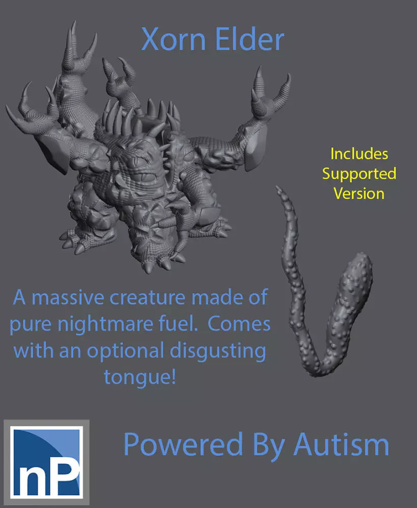 As Xorn age they continue to hunger and tend to go a bit mad. They also sometimes grow additional appendages and become misshapen abominations. Are they just the Xorn equivalend of Craxy Uncle Eddie, mostly harmless but deinitley a bit “off” or are the something else? Something possessed of otherworldly forbidden knowledge of elder things that shall not be named? The continued growth, or is it evolving into something new, of this elder Xorn finds it with two additional arms and legs. It’s giant mouth has contiued to expand and stretch and even split down the sides of its massive body and several of its teeth have been broken, maybe from trting to eat something that it shouldn’t have. More eyes have pushed out from somewhere within and a large tongue has now emerged to get a taste of its meals before devouring them. The tongue comes as a separate piece so you can choose to glue it into place or leave it separate for a surprise attack on your adventurers. This elder Xorn will fit nicely onto a 80mm base or you can have him stand on the table perfectly well without one. This pack comes with supported and unsupported versions for both (Xorn Elder and Tongue) models.