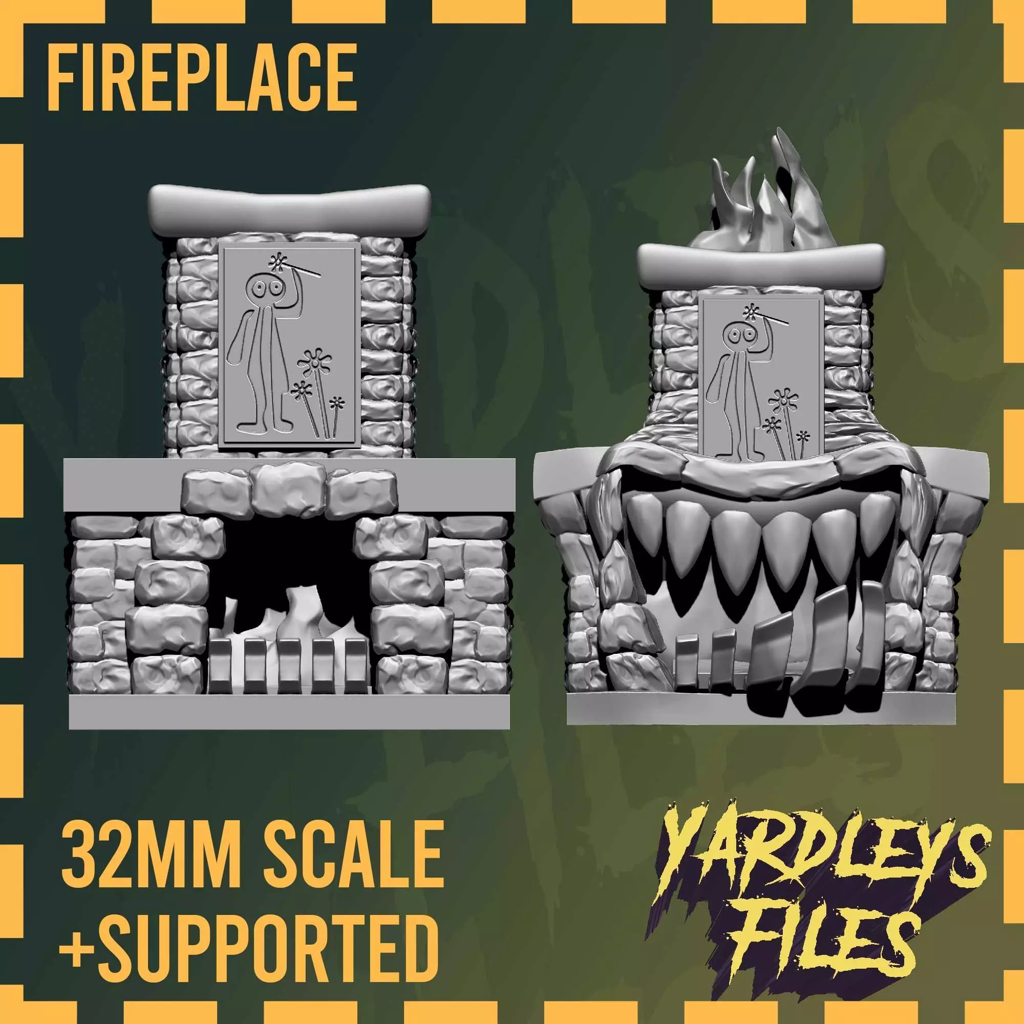 Ignite the enchantment of Emberheart's Grasp: Enigmatic Fireplace! This captivating model showcases a mystical stone fireplace, radiating warmth and mystery within the walls of taverns and inns. However, beware of the hidden threat as this hearth reveals its true form—a creature of fangs and deception.