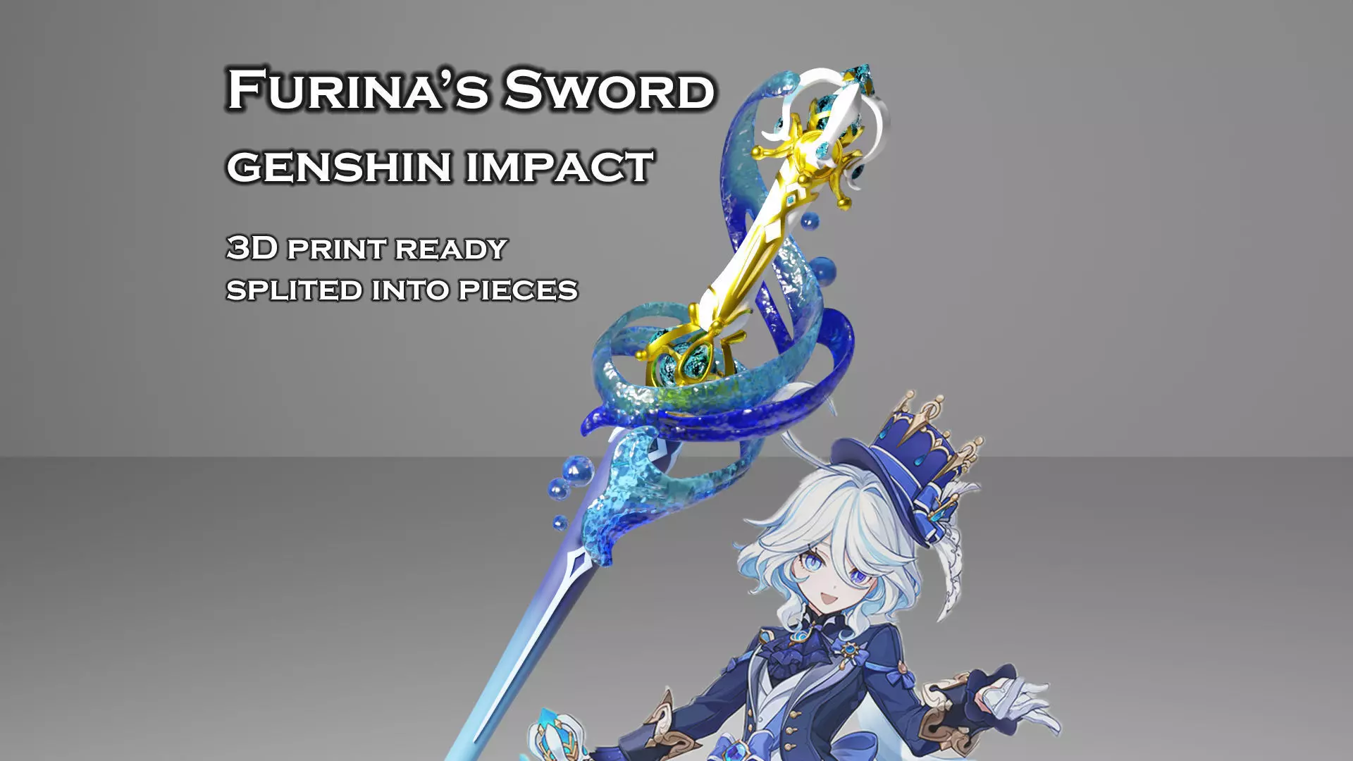 Genshin Impact Furina’s identical weapon, Splendor of Tranquil Waters. Ideal for cosplaying, decorating etc. It is a highly detailed model that is designed for 3D print. All details are real reliefs or engraves.