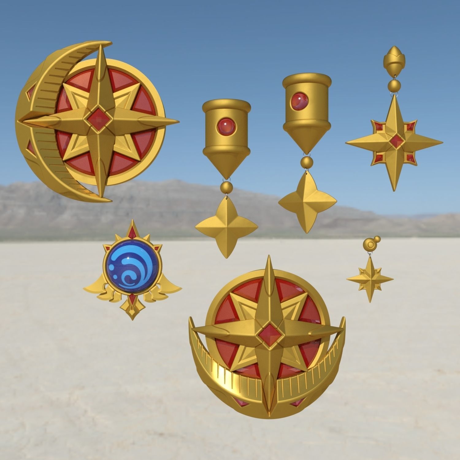 Set includes 3D models:1) Moon and Star Hat pin2) Star hair tail3) Cape button and Star pendant4) Vision Hydro6) Moon and Star Thigh badge