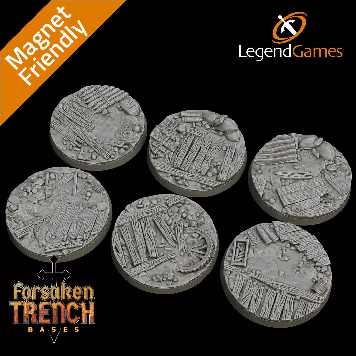 These 6 bases, 50mm round, are crafted with extra details that evoke the terror and horror of war in the Trenches. Our Detailed versions have Trech Crusade specific additions such as ammo crates, shell casings, sandbags, bonbs and similar detail. You may find the odd rat too, if any have survived the Mustard Gas attacks....
