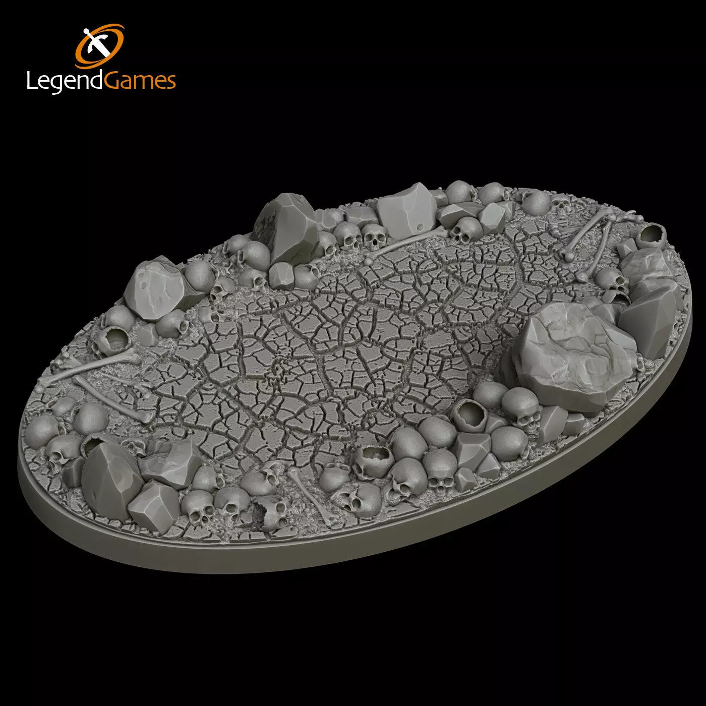 Legendgames Skull Bases come in a variety of designs, from full-skull models to open terrain with a few scattered skulls and long bones.Our base is usually a cracked earth surface with scattered rocks and stones intermingled with skulls and long bones.Some of our bases might feature shifting sands, bubbling mud or rocks and crystals, but in general they all have a consistent look and feel to give your armies a uniform look.Our bases feature a selection of skulls and bones, not just multiples of the same item. A lot of thought goes into positioning and aesthetics - these are not cheap cookie-cutter bases, these are top notch!