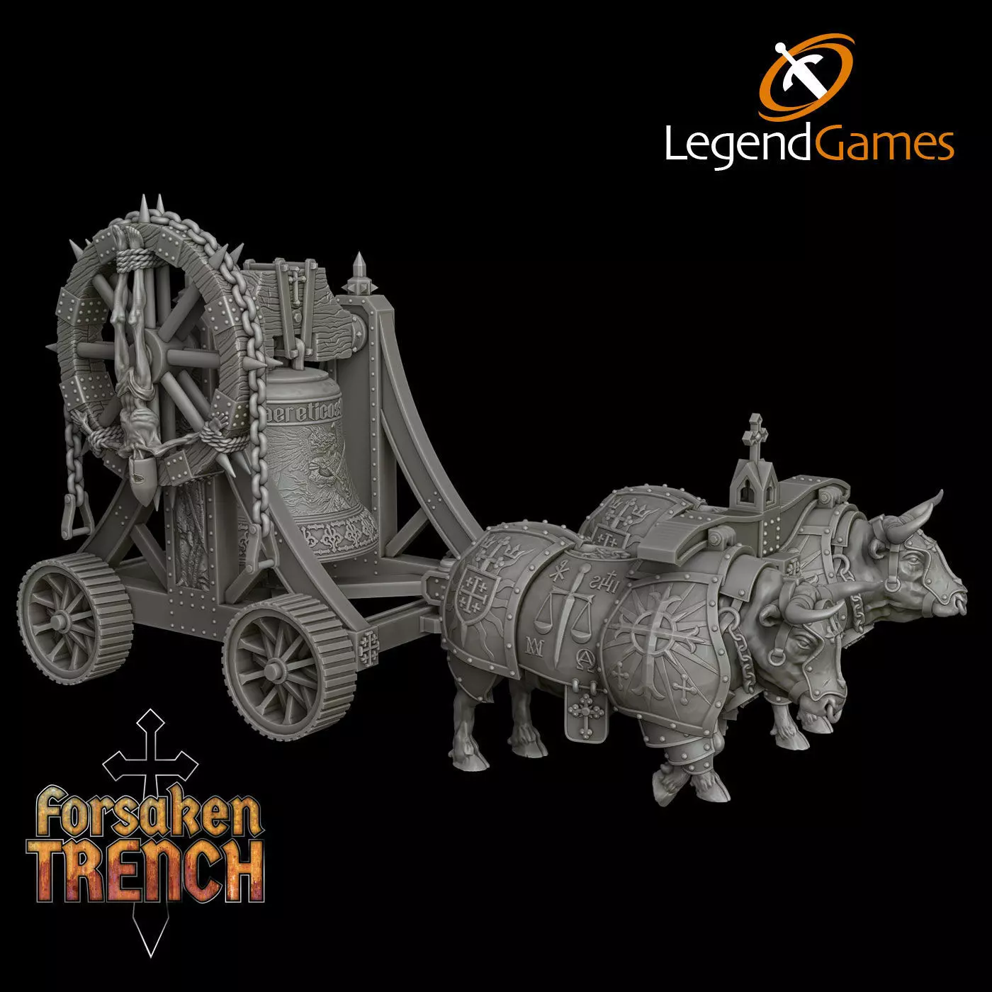 Now your battlefield may echo with that same dread solemnity.The Trench Crusade Bell stands upon a rugged chassis, wrought for the ravages of war. A great wheel sets its tongue to motion, calling doom upon the damned. Pulled by two great armoured oxen, no heretic will withstand the Bell.