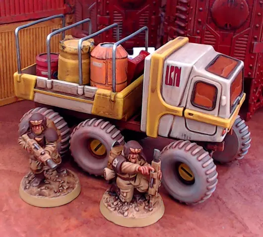 Outpost Utility Truck is a collection of 3D printable files that can be built into a variety of six-wheeled science fiction trucks. They have been designed to print easily and to work with a variety of 28-32mm scale figures. They can be used for scatter terrain on a sci-fi tabletop for a variety of systems like Games Workshop Warhammer 40K and Warhammer 40k Kill Team, Corvus Bellis Infinity, and many other sci-fi and post-apocalyptic games.