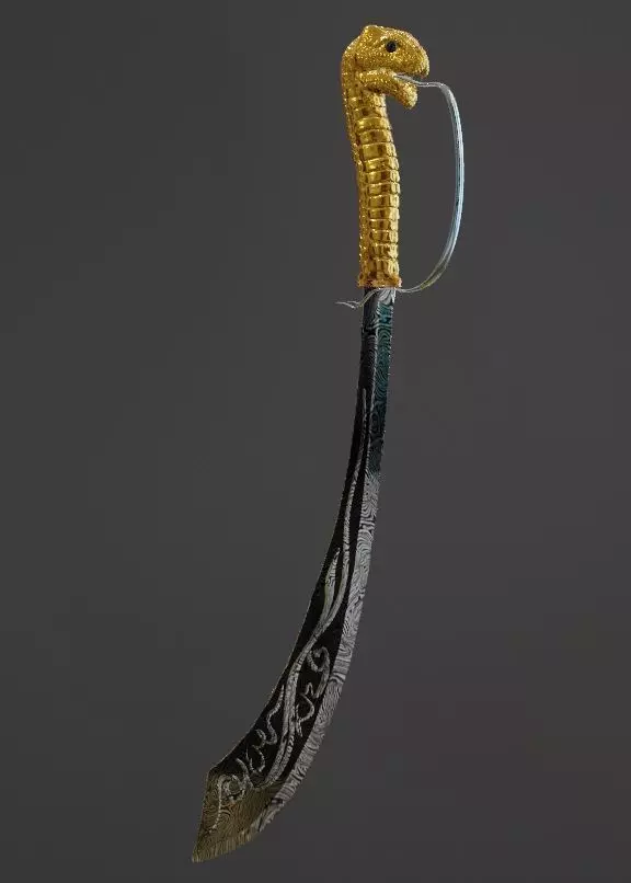 A saber or scimitar with a handle in the shape of a snake's head.The saber is designed for 3D printing for themed cosplay.