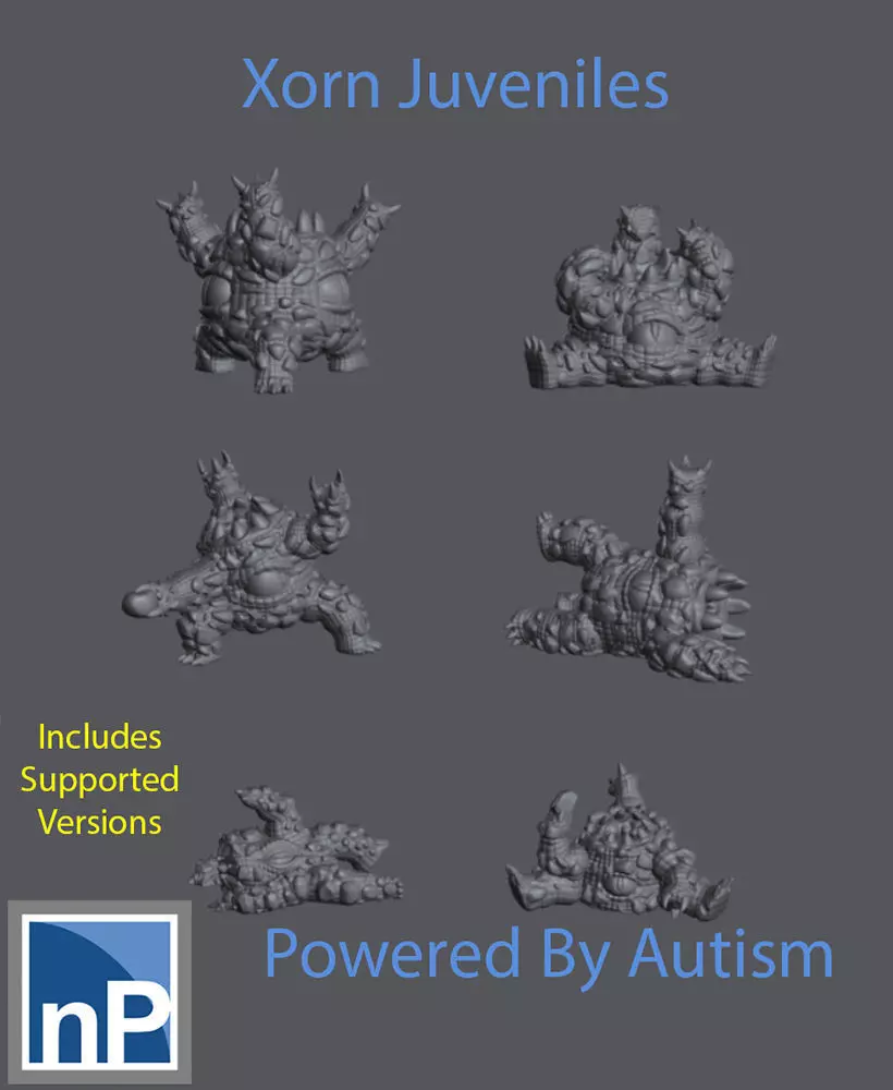When baby Xorn start growing up, the next natural state for them are as juvenile Xorn. In this pack you will find 6 unique scults of Xorn Juveniles. Each will fit well on a 32mm base or you could go without bases as they have been designed to sit or stand flat on your table. In the pack you will find two on the smaller side, two that are a bit older and larger, and two that are ready to gorge themselves on rocks and enter adulthood soon. You’ll find some lazy Xorn that are just lying around, some that are taking a break for a snack and having a seat, and a pair that are walking around looking for their next meal. Two are holding rocks, to either be used for food or to be thrown as an improvised missile weapon. With Xorn eating rocks for nourishment, if they throw one at you are they trying to start a food fight? This pack comes with supported and unsupported versions of all six models.