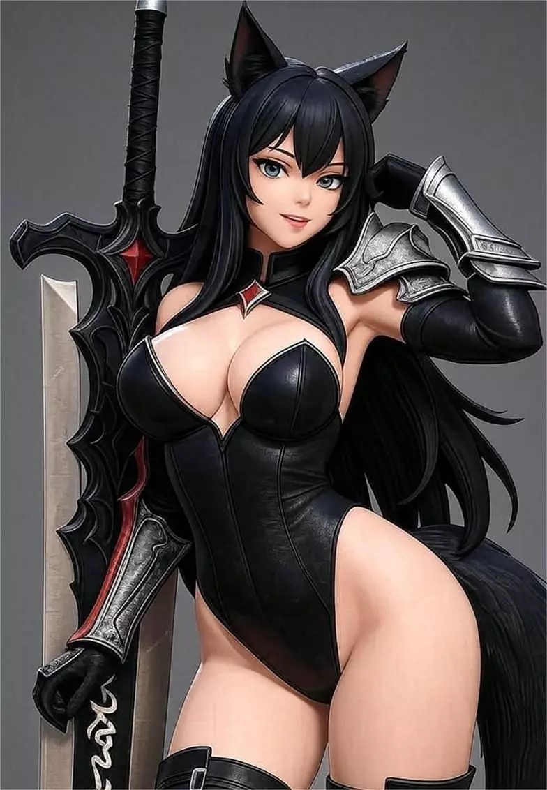 A high-detail 3D character model of a fantasy warrior inspired by anime aesthetics. She features long black hair, fox-like ears, and a sleek, form-fitting black armor accented with silver and red details. Armed with an oversized greatsword, her confident pose and expressive face capture both elegance and strength.This model showcases a stylized female warrior rendered in a semi-realistic anime style. The design emphasizes anatomy balance, material contrast (leather, metal, and skin), and detailed hard-surface armor sculpting. Optimized topology and PBR texturing ensure high visual fidelity in both real-time and cinematic settings. Rigged and ready for animation or game integration.