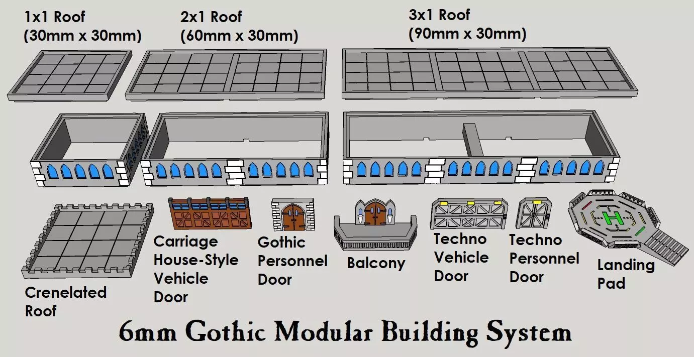 This is a set of parts that can be used to create your own Gothic buildings for wargaming or 1/300-scale dioramas. The basic footprint of the smallest block is 30mm by 30mm, by 10mm high. The surfaces of the blocks are flat so that they could fit together, so the detail is entirely debossed. These should be generally compatible with both 6mm and 8mm wargames or dioramas. The set includes: