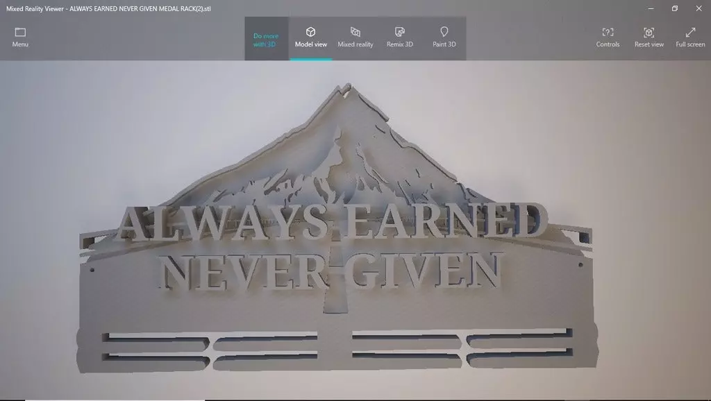 This is a gift I made for my sister for her birthday/Christmas present. She wanted a medal holder for her Marathon Medals so I came up with this design. 50% infill was used to give it the strength to support the weight of the medals. Support is needed for the gap that I left behind the run that holds the medals to make it easy to slip them on. You can either nail it to the wall or run a string through the holes and hang it that way. This is a modified version of the one I made as you can see from the picture but still the same. Enjoy! UPDATE: Just added a no type background so anyone can add whatever type they want. Enjoy.