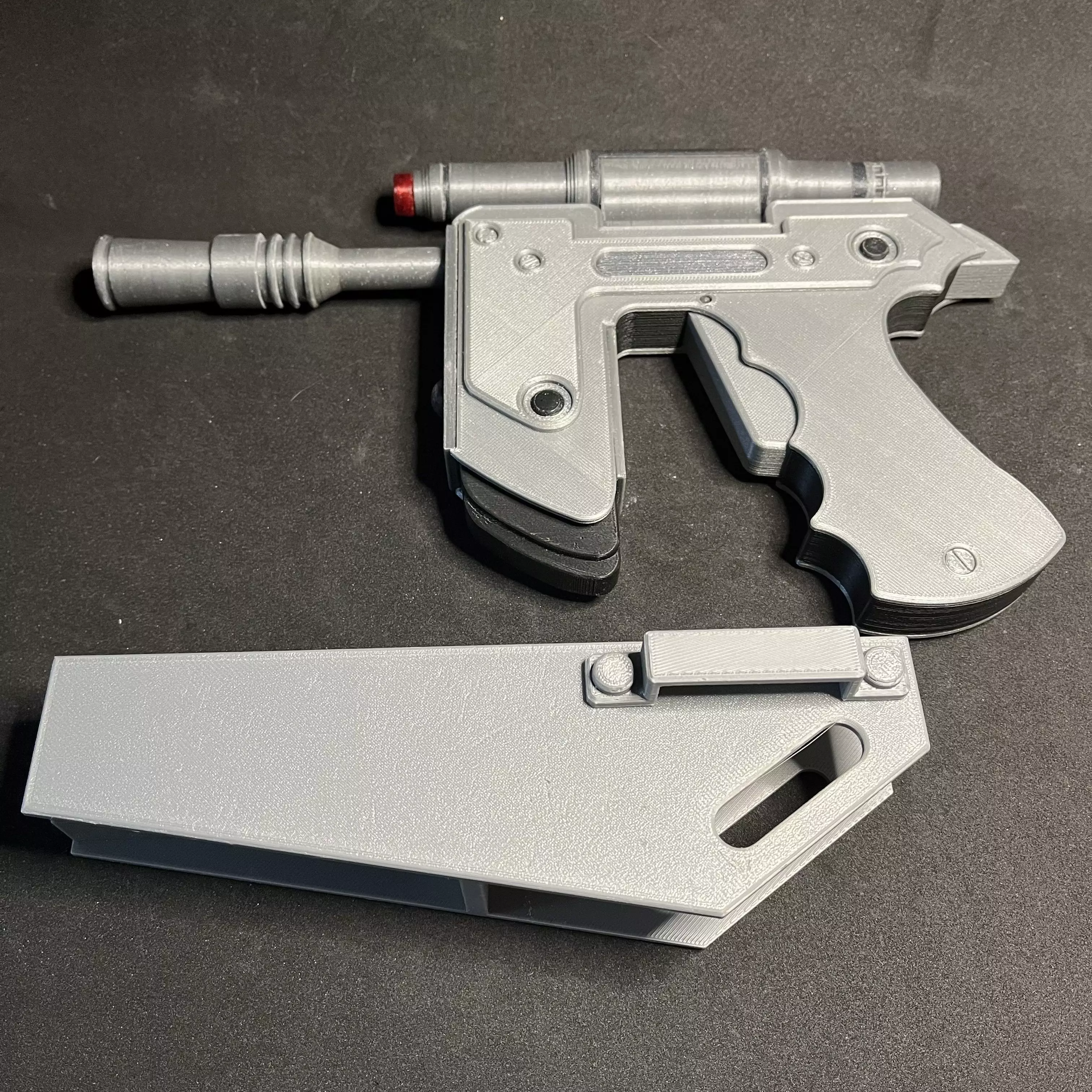 I'm getting into creating props for cosplay, so expect more to come! This model is based on the blasters used by the crew of the Scorpio in Season 4 of the original Blake's Seven. There is space inside the frame for mounting electronics although the original didn't have any installed (I can't do electronics, but I appreciate others can). I've also now added the matching holster.