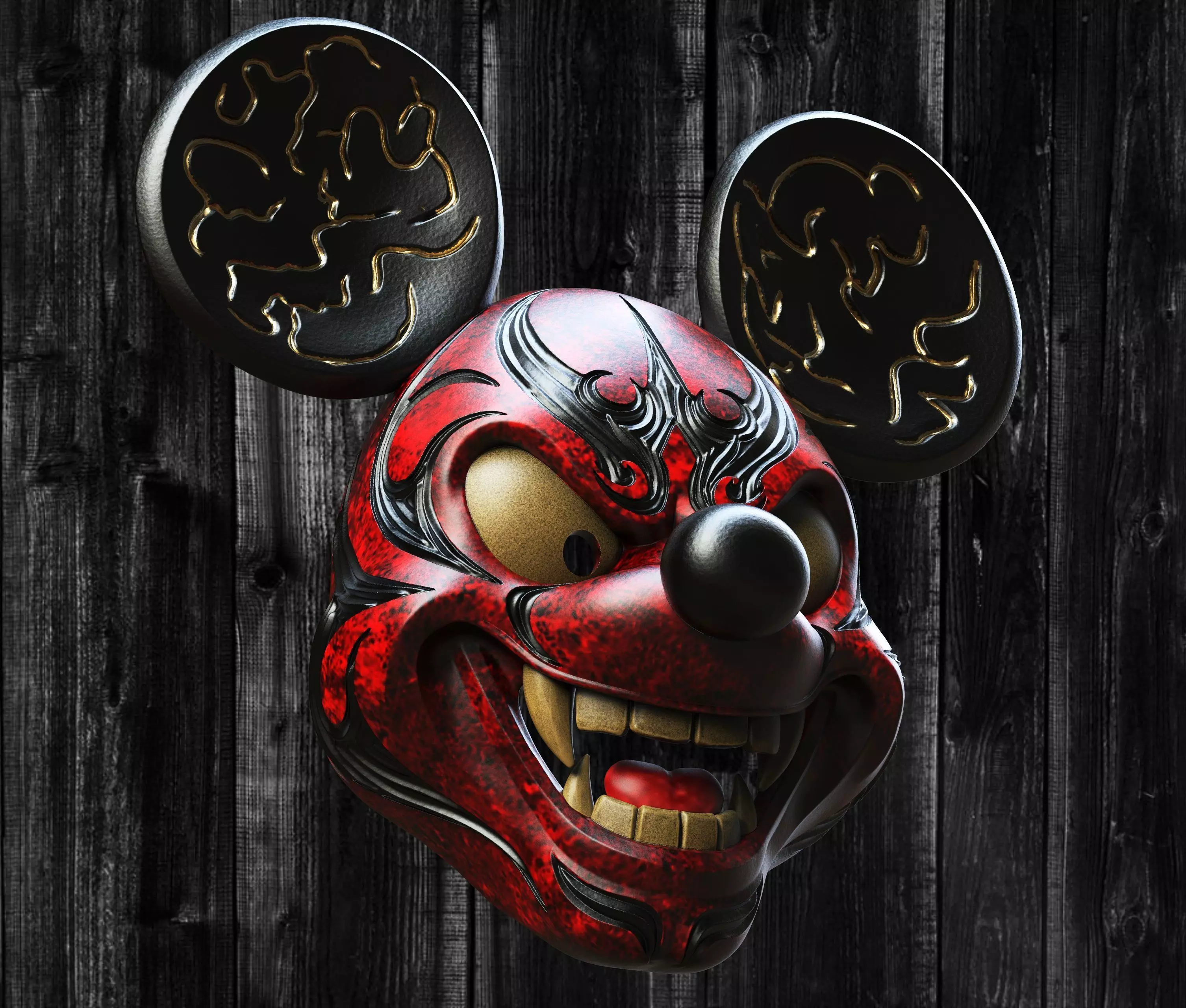 This 3D model of the mask is a sinister demonic version of the iconic character, created for 3D printing. The model is perfect for cosplay, horror events and collecting.Features:Design: classic Mickey Mouse head shape with demonic elements - elongated and pointed ears, deep cracks and relief details, creating the effect of an ancient curse.Mouth: wide open mouth with long sharp teeth, uneven and chaotically located, creating the feeling of a creepy grin.Size: optimized for printing at a scale of 1:1 with convenient fastenings for belts or elastic bands.The mask is suitable for 3D printing with the ability to customize the size and subsequent painting to achieve the maximum effect of the demonic image. File for print it personally on a 3d printer. The size of this design is adjustable to your needs. After Payment You will get directly the link to Download.This design was made by the Maskitto team. All the rights belong to the creators, therefore, it is forbidden to resell nor share this design as a digital file.However, you are allowed to sell the product you print on your 3D printer.The mask is sized for a standard adult's head.Print size mask : length - 217 mm width - 217mm height - 200mm.