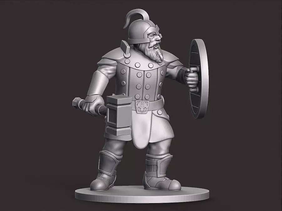 A dwarf warrior miniature, sculpted in zbrush and ready to be 3d printed. A stalwart dwarven warrior wearing reinforced leather armor and wielding a warhammer and round shield. This character would fit great into your boardgame, tabletop wargame, or role playing game such as Dungeons and Dragons, Palladium, Lord of the Rings, etc. Would be great to portray a fighter, warrior, knight, paladin, or other character.