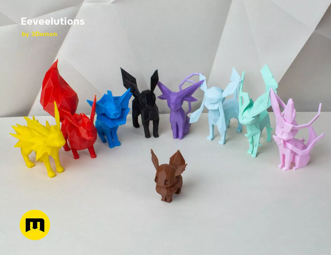 Pokémon that are ready for 3D printing: Eevee, Vaporeon, Jolteon, Flareon, Umbreon, Espeon, Leafeon, Glaceon, Sylveon