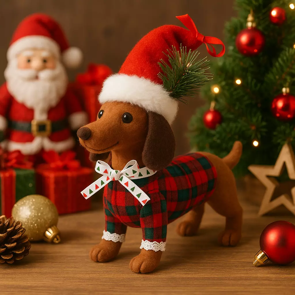 Bring warm holiday charm to your collection with this adorable festive dachshund model, designed in a classic red tartan outfit with delicate white lace trim and topped with a bright Santa hat. A decorative ribbon around the neck and a small pine accent add extra seasonal character, giving the piece a cozy and cheerful Christmas feel. The sweet expression, rich brown coloring, and playful stance make this dachshund especially eye-catching as a decorative display item.