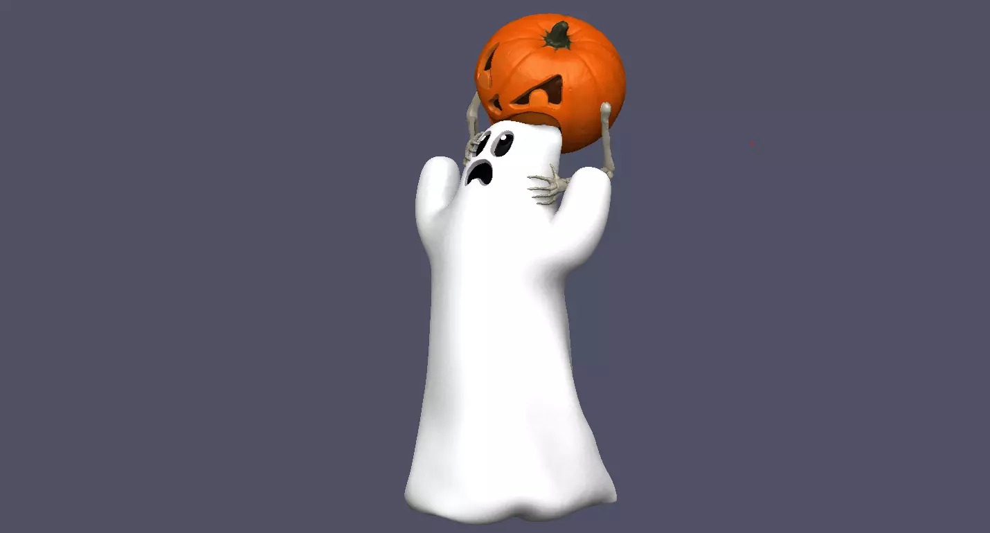 Design and 3D modeling of a ghost being bitten and chased by a pumpkin.