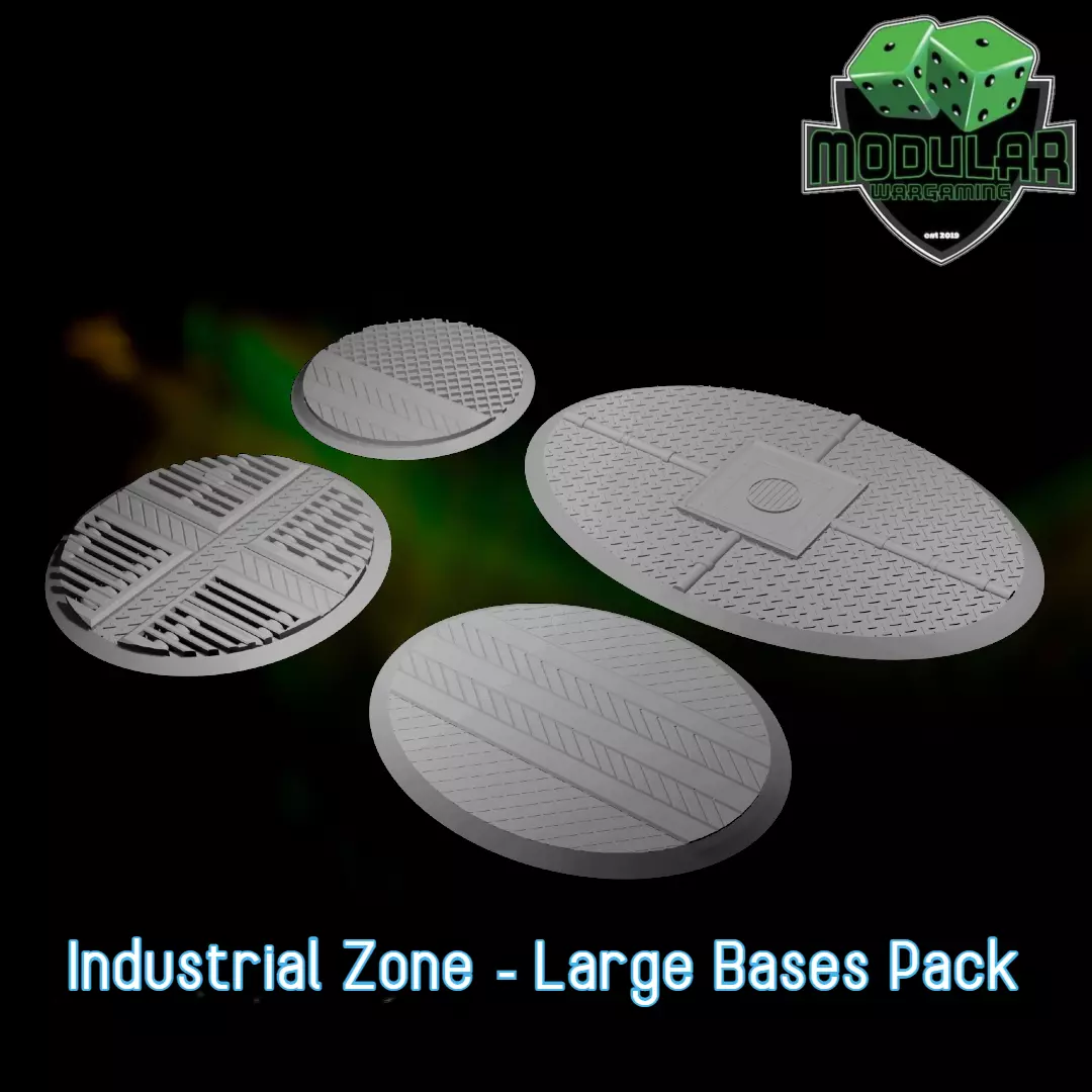 In this file you'll find 4 different types of Industrial Zone bases sized at 80mm, 100mm, 120x92mm, and 170x110mm. Perfect for all of your larger model needs.