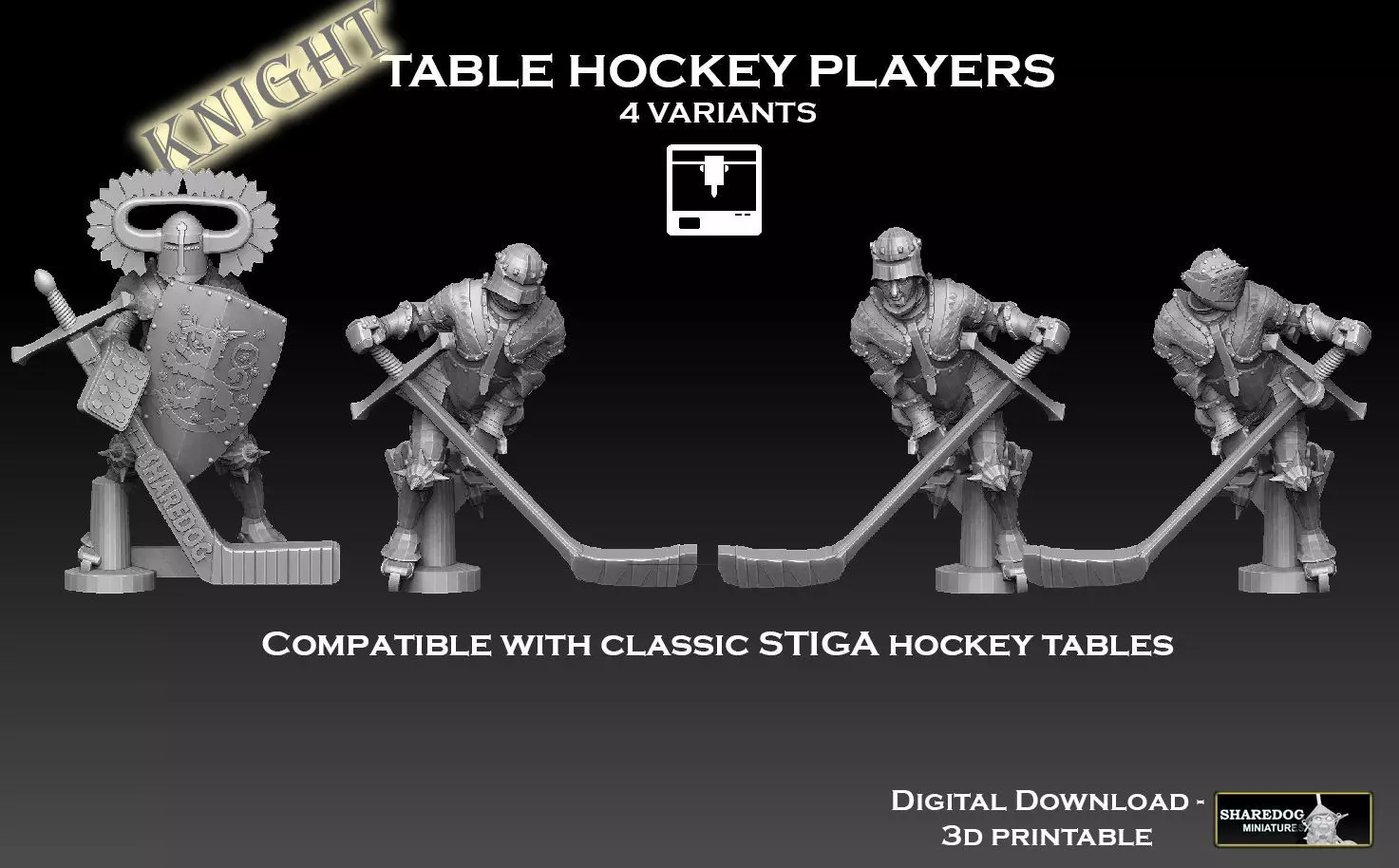 Four Table Hockey player models, including a goalie. This is the knight version -other fantasy-themed table hockey teams will be released in the future. Compatible with classic STIGA table hockey tables. Please read the information further down on this page.A great alternative if you've lost some of your original figures (as is wont to happen), or if you just want to customize your game with a different type of figures.
