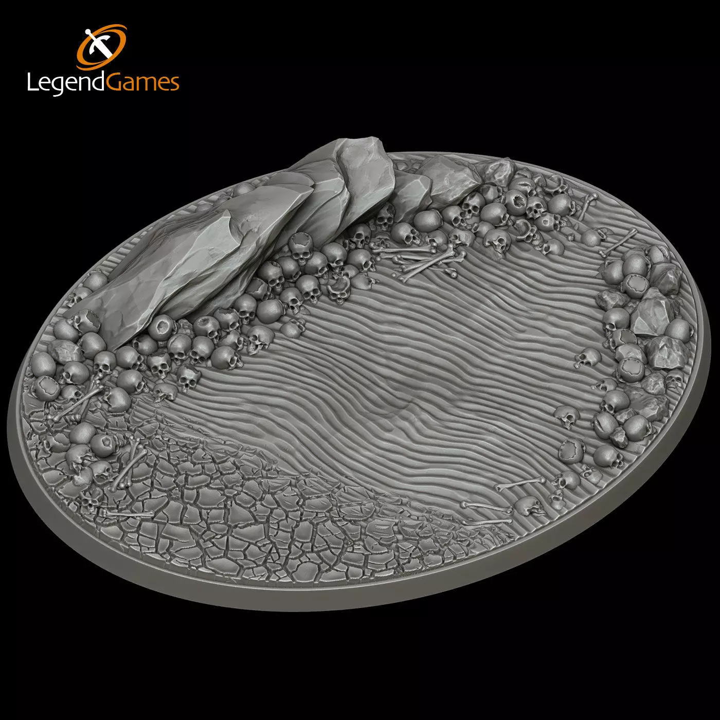 a set of TWO oval large flying creature bases for your tabletop war games. Featuring our cool Skull, bones and rocks design with cracked earth and shifting sands, these bases bring your chos armies to life on the battlefield.