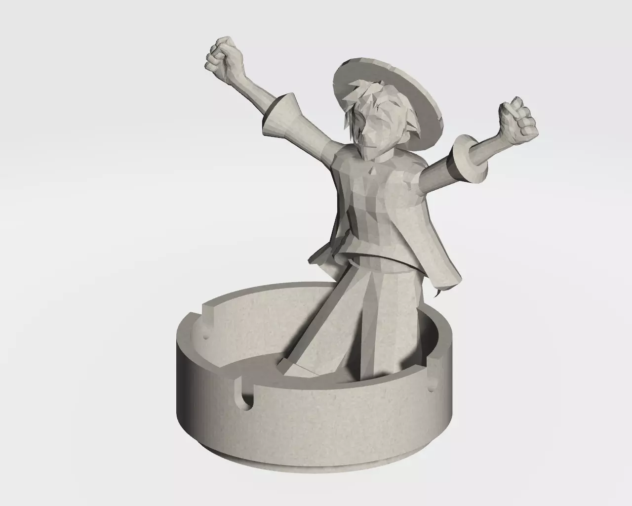 Bring the spirit of adventure to your tabletop with this unique One Piece-inspired Luffy Ashtray. This original 3D model features a stylized, low-poly version of a pirate character triumphantly rising from the center of a round ashtray—arms raised high in signature celebration. A perfect fusion of utility and fandom, this design doubles as a conversation piece and a functional ashtray.