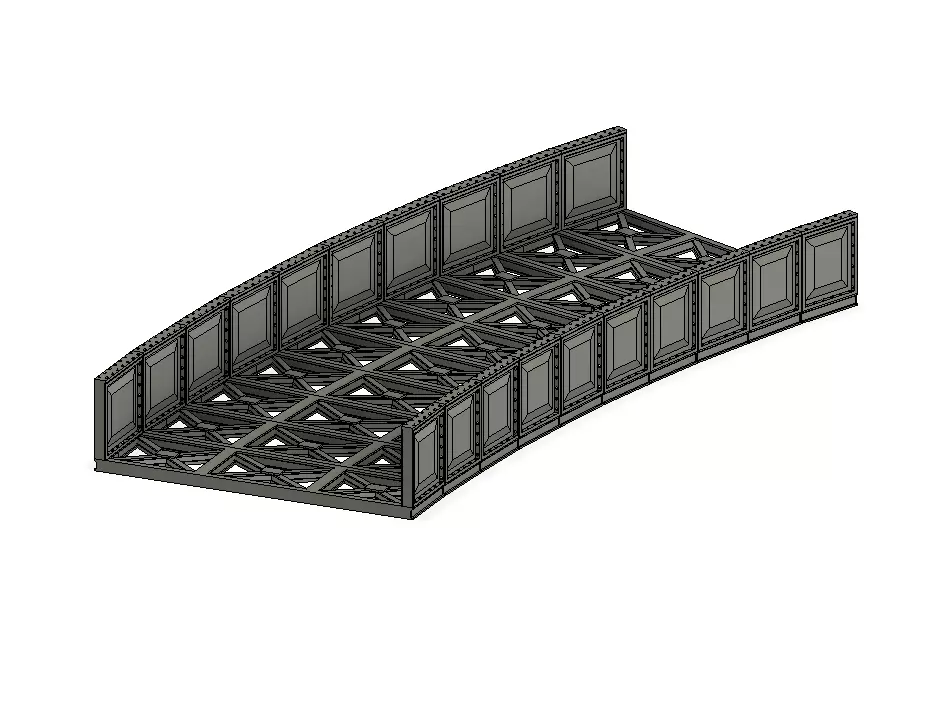 Sections are 22.5 degrees, and 16 sections will make a circle. For those with larger printers or printing in smaller scales, I will include sections that are 45 degrees.I have also done a 2nd radius (438mm) and 4th radius (572mm) versions.. I will also look at adding some pillar supports for those who may need them.https://www.cgtrader.com/3d-print-models/games-toys/other/model-railway-2nd-radius-curved-bridge-deskhttps://www.cgtrader.com/3d-print-models/games-toys/other/model-railway-4th-radius-curved-bridge-deck