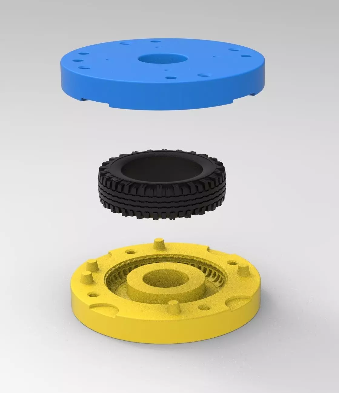The bottom mold part has 5 special bosses and Top mold part has 5 special holes to guide mold parts in the closed state. Also, there are 4 slots for better opening with a screwdriver or similar instrument.In the Top mold part are 4 small holes for material injection.Both mold parts have 4 holes with diameter 6 mm for bolting it in closed state.Note! Only the mold! This is not a tire!