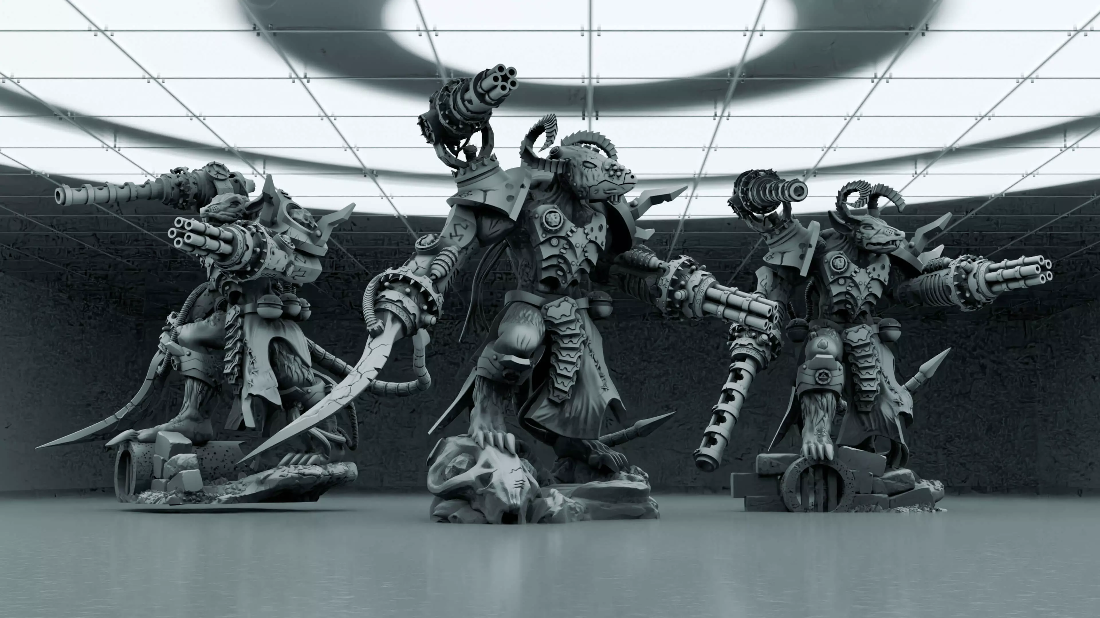 Ratkin storm bringer, heavy weapons team. A set of fantasy miniatures for use in tabletop/wargames. Comes with 3 bodies, multiple weapons and optional shoulder weapons.