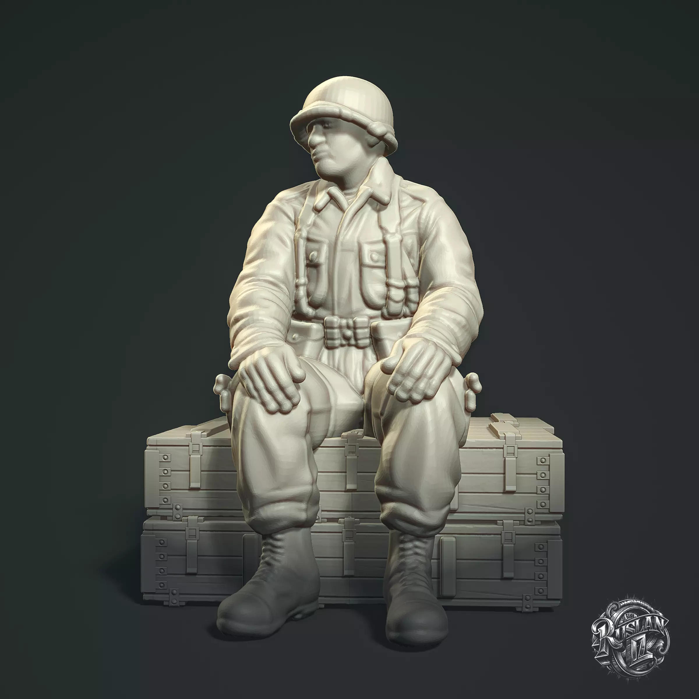 Introducing our new 3D model - a soldier in a relaxed pose sitting on stacks of crates. This model is perfect for dioramas, war games, and collectible sets.