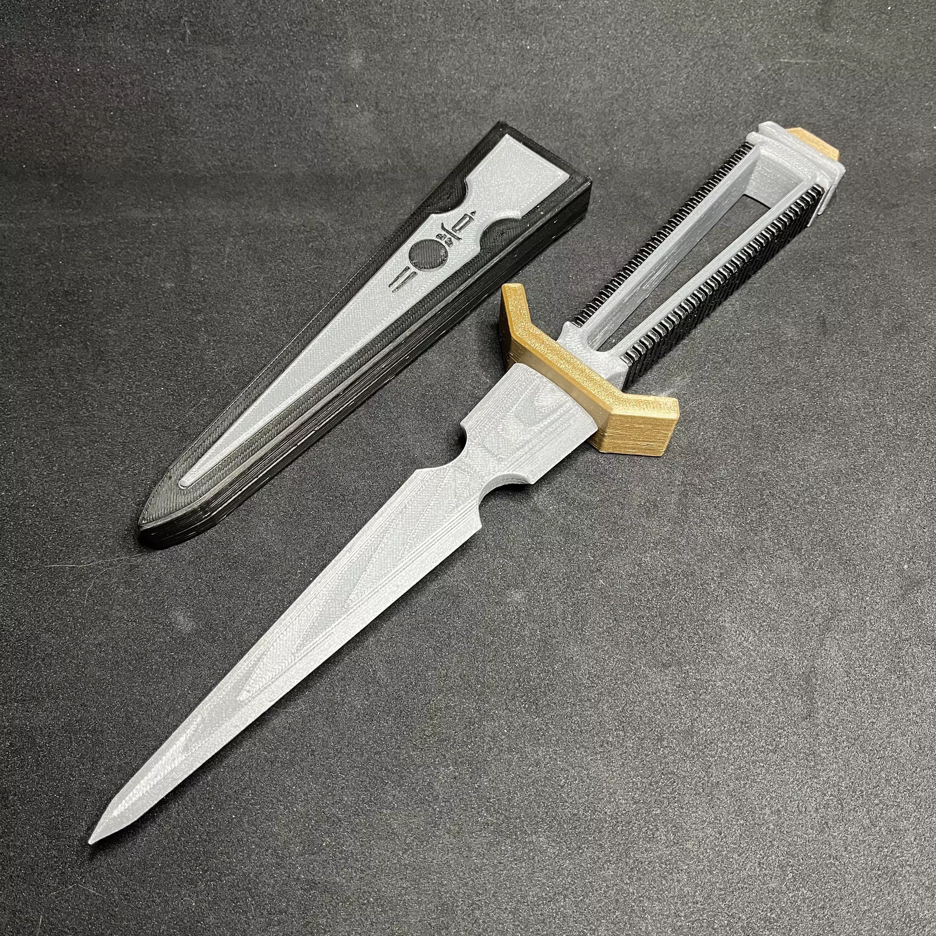 Anyway, crewmembers of the ISS Enterprise generally carried two pieces of equipment with them at all times: the Agonizer (which I've also made and will be posting very soon) and their dagger. There have been SO many different versions of the dagger made over the years, and this is kind of my interpretation of it (Uhura's dagger, the one she almost stuck into Sulu, was just plain silver). The version in the photo features a very nice antique brass-finish filament I found for the pommel and crossguard (eSun Metal Antique Silver, if you're interested), silver for the blade and body of the handle and a very nice metallic black for the grips and the scabbard. The scabbard has an attached ring to slip a belt through it, although, as always, I do recommend being as gentle as you can. It is a 3D printed model after all, and not a functional weapon. I've also, after a request from a very nice customer, included a hilt which is a little more like Uhura's dagge from Mirror, Mirror in the Original Series. Happy to take requests!