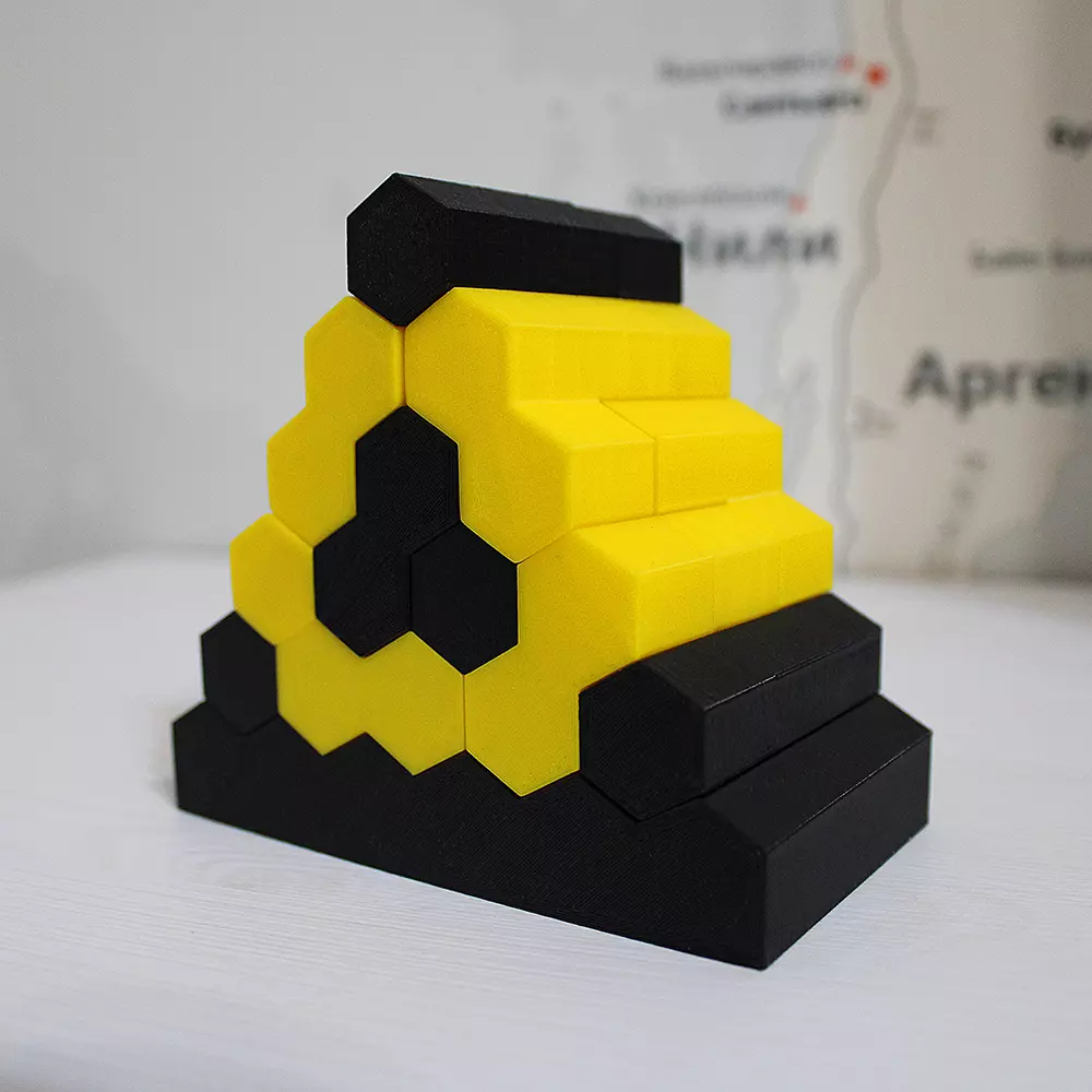 Beehive puzzle seems simple at first glance. In fact, it is difficult. The two colors in the puzzle make it a little easier to solve as you understand where which elements can be placed.