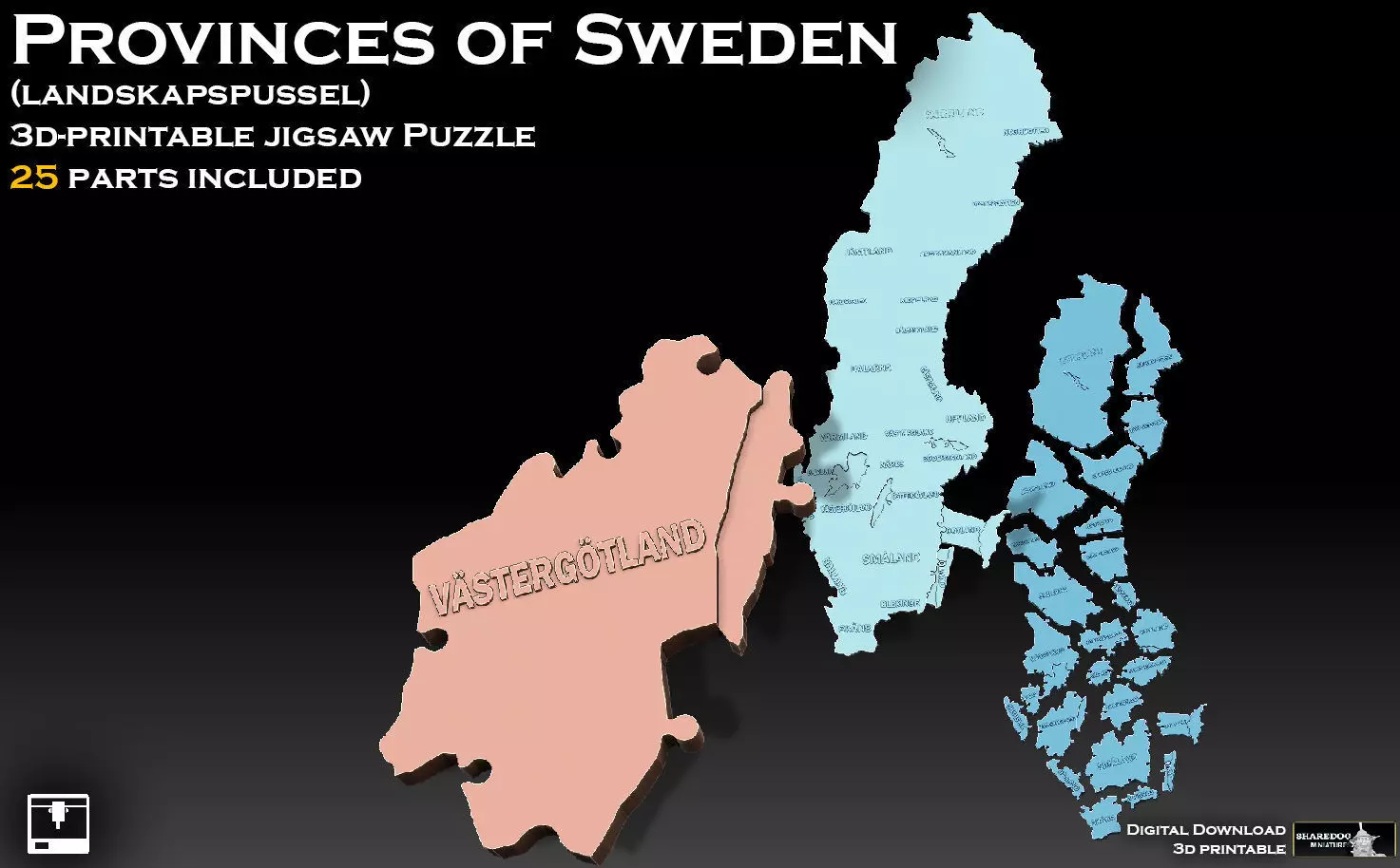 Each puzzle piece is one of Sweden's provinces (aka landskap). Something for your kids to train geography and spatial thinking on.The landskaps have only nominal administrative importance today, but are generally speaking still something that the local population identifies with to a greater degree than certain other administrative divisions. People in Dalsland think of themselves as dalslänningar, people in Uppland consider themselves upplänningar, and so on. The landskaps have their origins in medieval times, and their boundaries have been virtually unchanged since at least the 16th century.