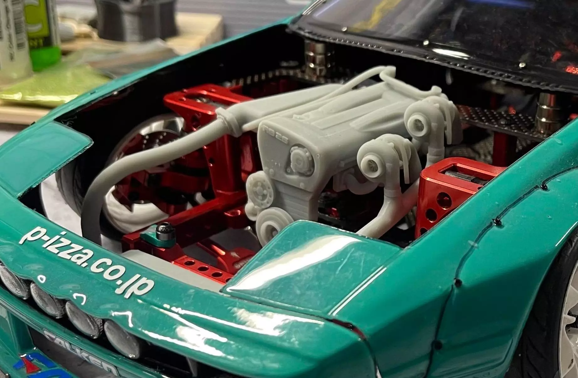 This is a Nissan RB26 (RB26DETT) engine model for Rhinomax II chassis. It consists of multiple parts, which need to be glued together after painting. Whole assebly can be detached any time by just undoing 2 bolts holding the intercooler brace to the chassis.