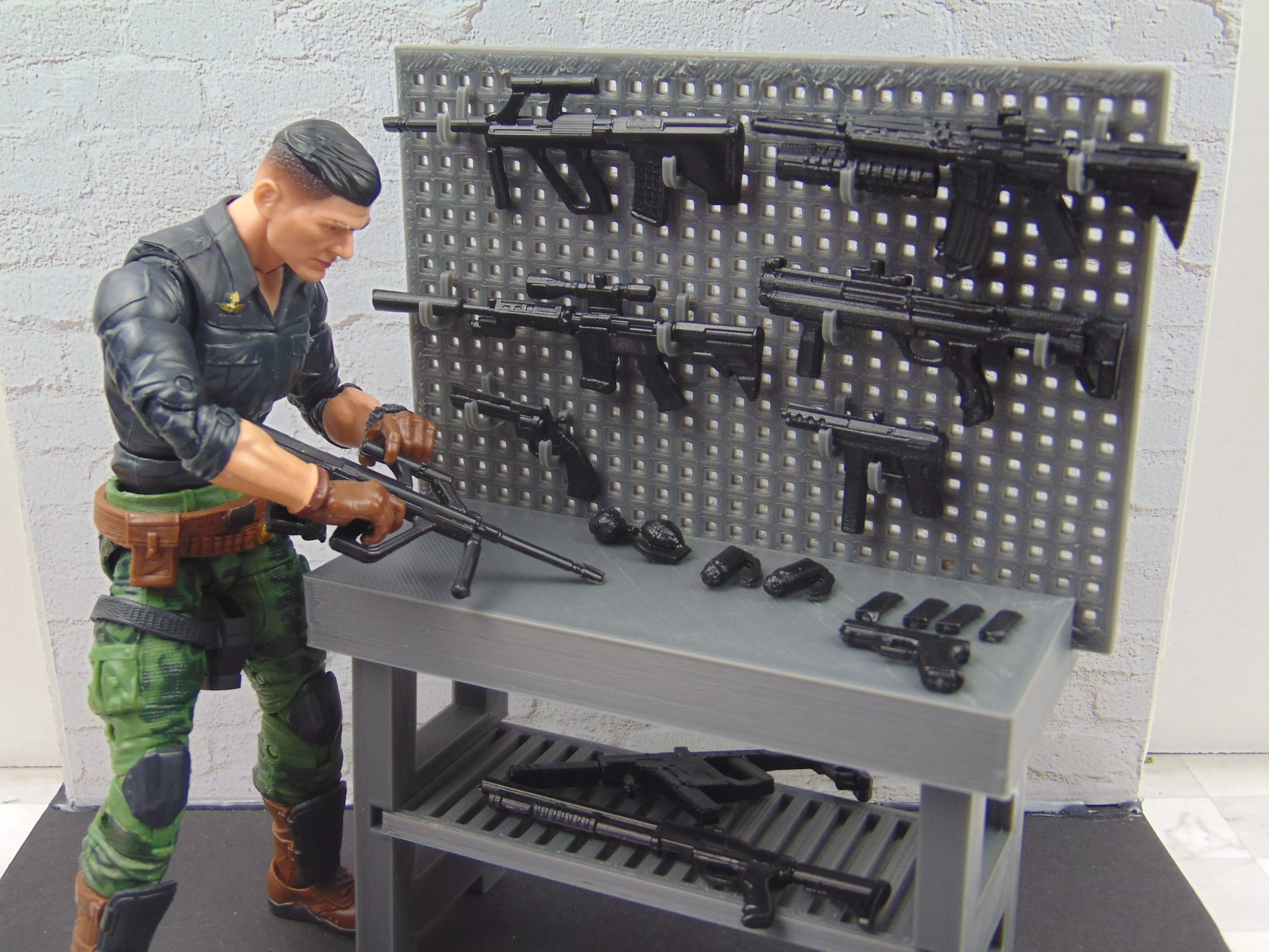 This is a 3D Print file (STL) to print your own 1:12 Scale Workbench Weapons Rack Diorama Prop Display Accessory Set.