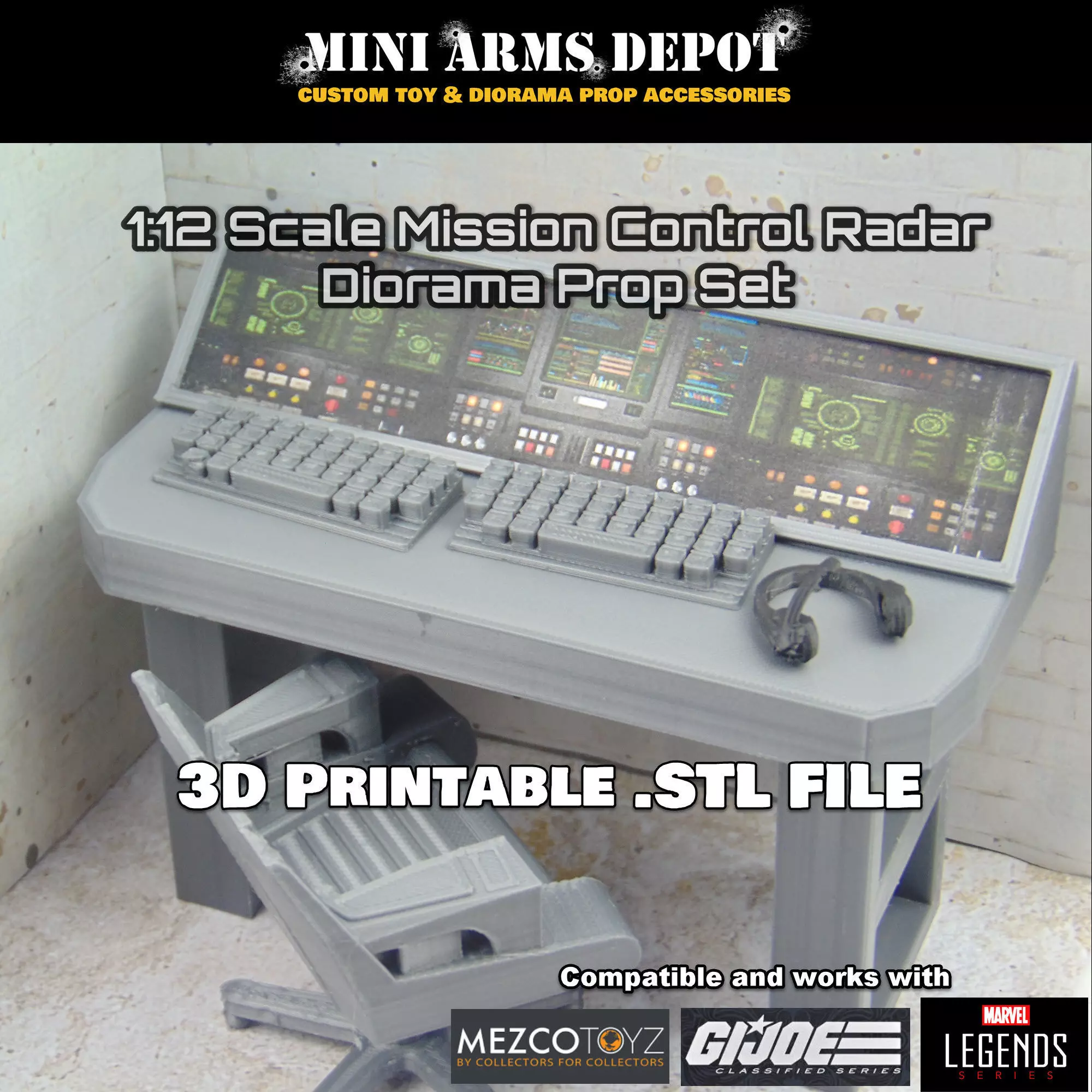 This is a 3D Print file (STL) to print your own Mission Control Radar Panel Table and Chair Diorama Prop Accessory Set.