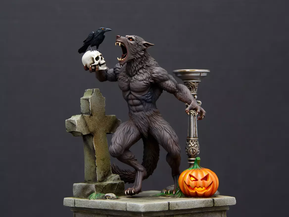 This COLORFUL 3D model features a fierce, wolf-like werewolf standing upright on a sturdy base, clutching a human skull in its gnarled hands and howling upward. Sculpted in an elegant style with clean lines and a minimalist aesthetic, this figure captures primal energy and is ideal for high-quality 3D printing.