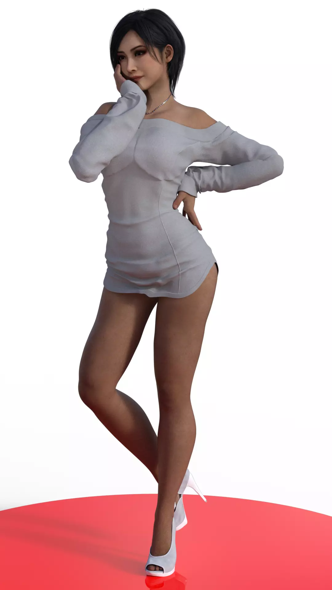 A highly detailed, photorealistic 3D render of a woman with the distinct likeness of Ada Wong. She has short, dark hair styled in a bob. She wears a tight, light gray or pale blue off-the-shoulder sweater dress that is extremely short, resembling a long top, highlighting her legs. She is accessorized with a delicate silver necklace. Her pose is confident and alluring, with one hand on her hip and the other resting gently on her cheek/jawline. She wears white or light gray peep-toe high heels. The render uses soft, studio lighting to emphasize the texture of the knit fabric and the realistic skin tone.