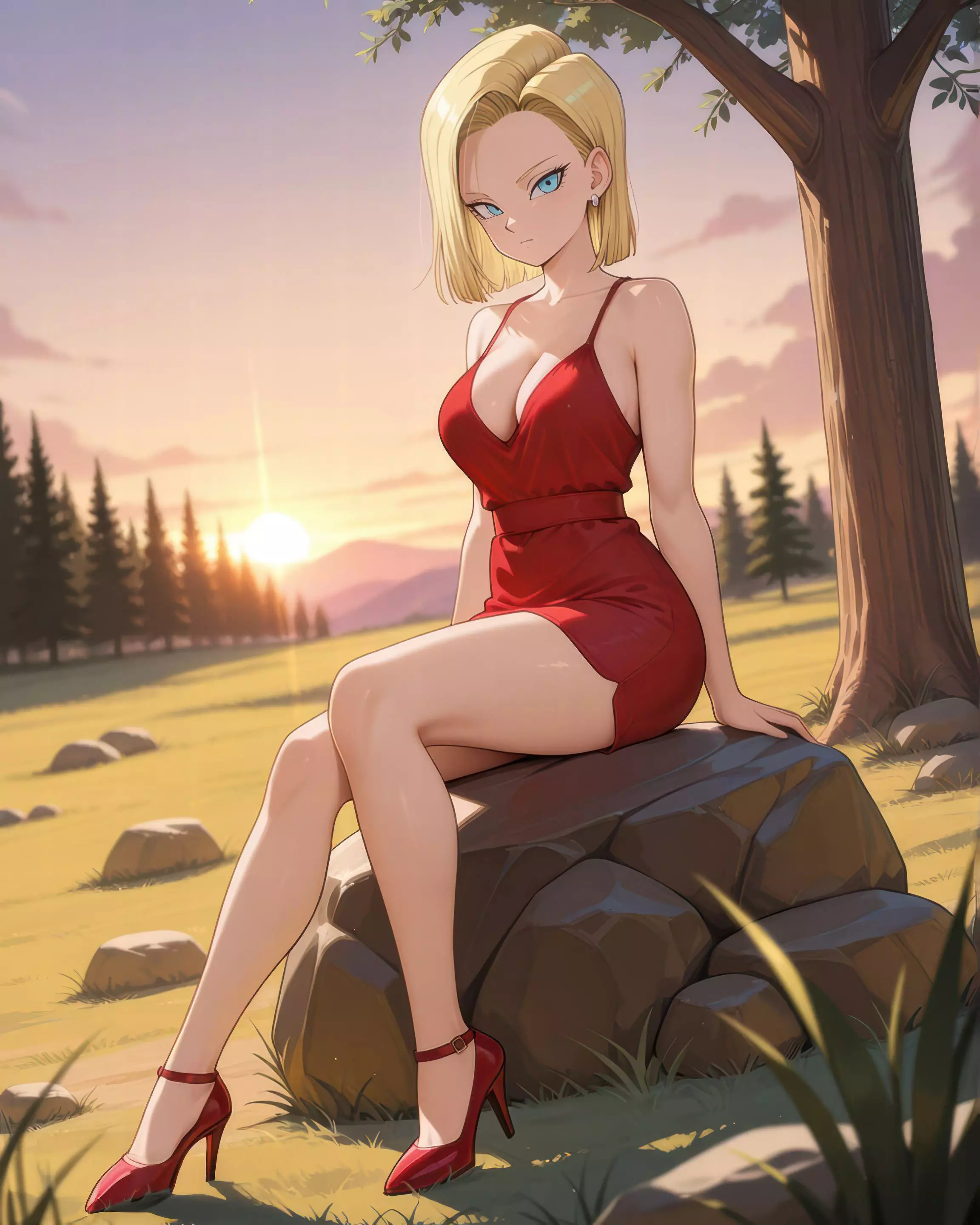 In this anime-style illustration, the iconic Android 18 from the Dragon Ball Z universe is portrayed in a completely different light. Sitting gracefully on a large rock beneath the shade of a tree, she gazes into the distance as the golden sunset paints the sky with warm tones. She wears a fitted, short red dress that accentuates her figure, perfectly matched with high heels of the same shade. Her signature short blonde hair frames her sharp, serene expression. Surrounded by a natural landscape filled with pine trees, scattered rocks, and open fields, this scene reveals a more elegant, calm, and human side of the powerful android warrior. The soft glow of the setting sun adds a romantic and melancholic mood to the atmosphere, capturing a moment of unexpected beauty and sophistication.