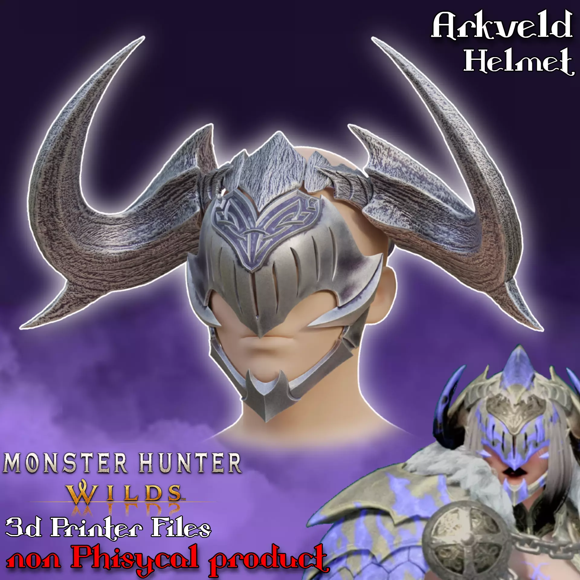 Files to print Arkveld Cosplay Helmet from Monster Hunter. The supports required. Some parts need to be printed multiple times (file names contain the approximate quantity).Ready for ENDER 3 v2 or similar 220x220x250mm size printer. Many division options for convenient printing included. Horns are removable on 10x2mm magnets. Designed for 54cm head circumference.