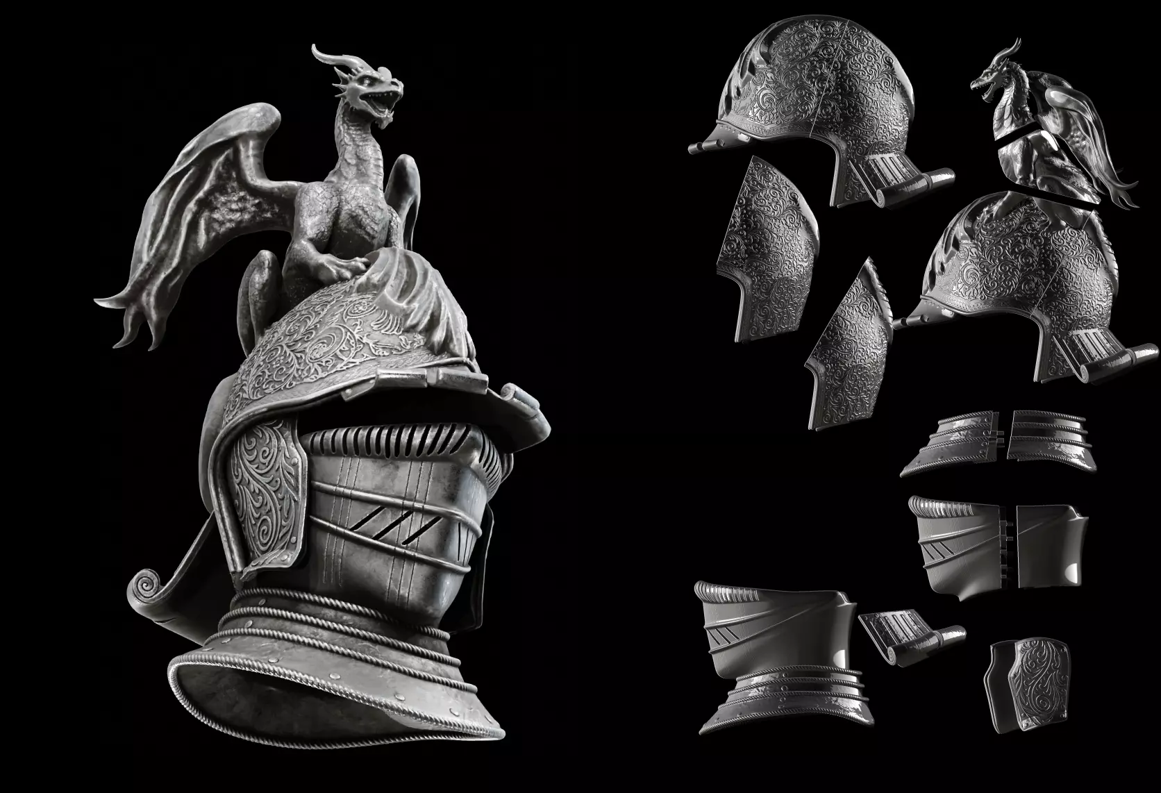 *Every plate is densely covered in ornamental detail, featuring subtle surface variations and a tangible steel structure for an ultra-realistic, richly decorated look.*The model is delivered in multiple modular parts, including both solid and split versions for easier printing:
