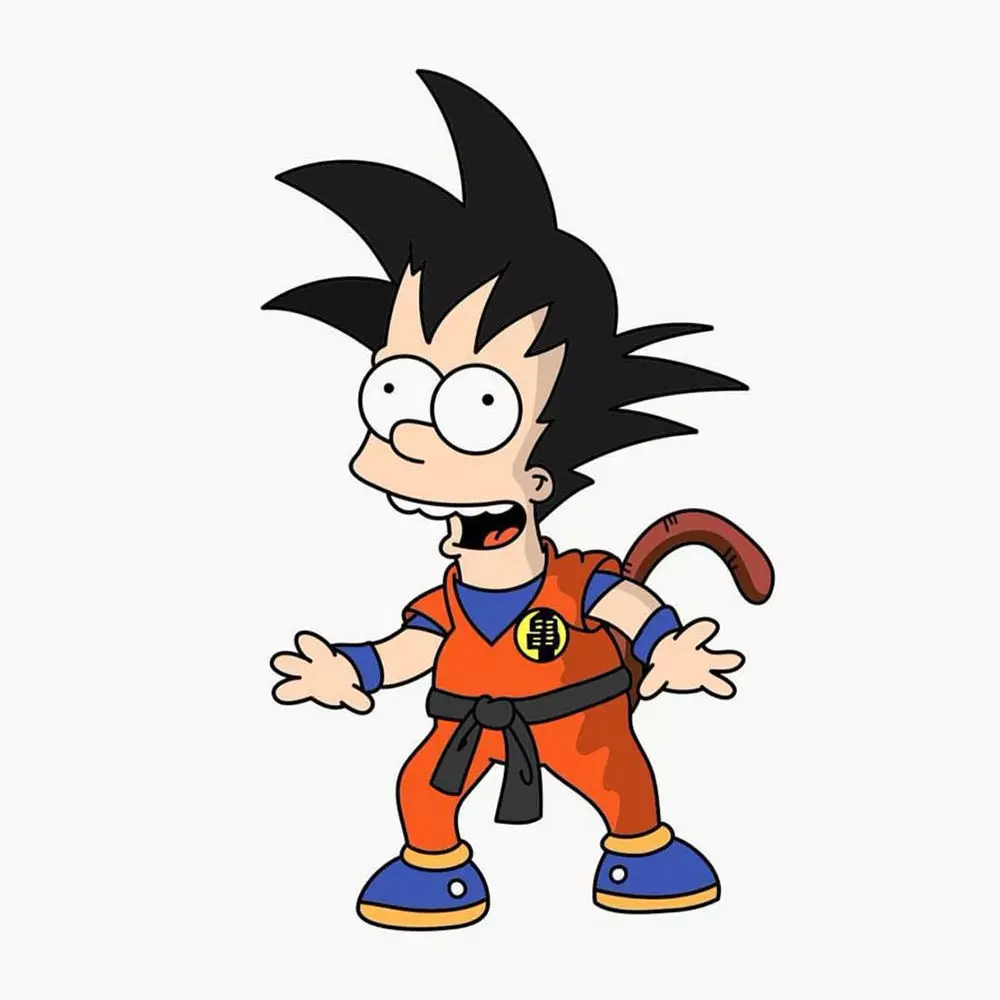 Bart Simpson as a Saiyan Goku mashup reimagines the mischievous Simpsons kid as a powerful Dragon Ball Z warrior, blending Bart's spiky hair and cheeky attitude with Goku's iconic Saiyan traits. This fan art fusion typically shows Bart with yellow Simpsons skin, Goku's wild black spiky hair (often glowing golden in Super Saiyan form), a compact orange gi adapted to his slimmer frame, and a playful tail for that Saiyan edge.