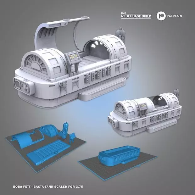 This set, scaled for 3.75 (but can be upscaled to Black-Series) includes the opening and closing lid action, there are a few options, the main base includes a single file and a split file to accommodate different printer sizes.