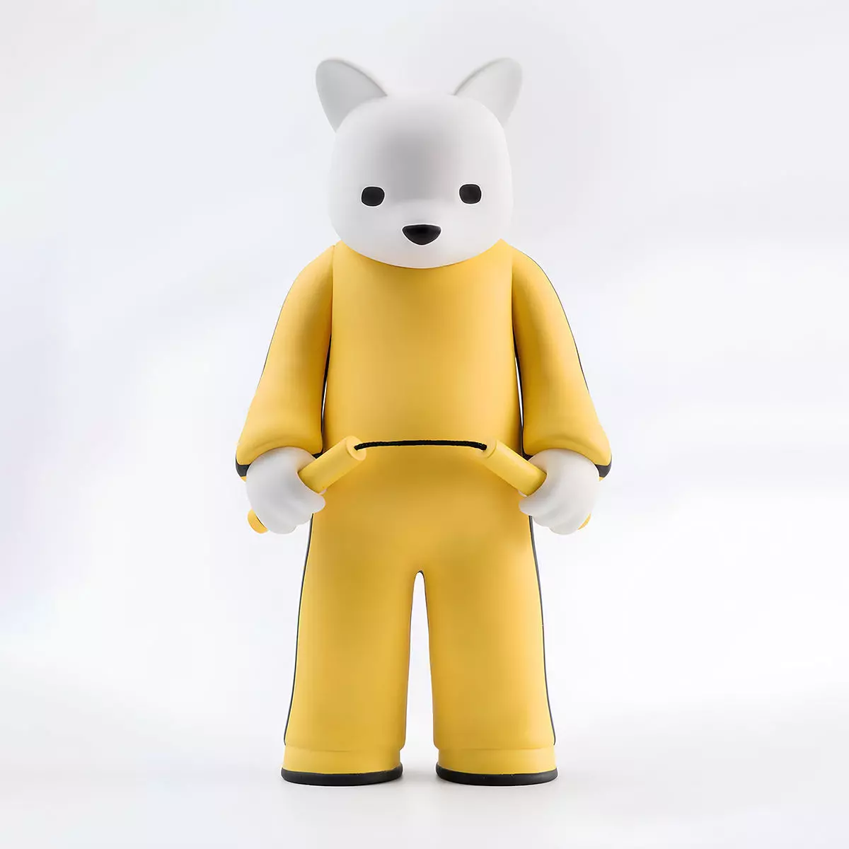 Bruce Lee Bear Bruised Lee figure from the movie Game of Death is a vinyl collectible created by artist Luke Chueh in collaboration with VTSS Toys. It combines Chueh's signature bear design with Bruce Lee's iconic yellow jumpsuit from Game of Death. The figure stands 6.3 inches tall and comes with a pair of articulated nunchakus. Both the figure's head and arms can be rotated. This edition was limited to 500 pieces and originally retailed around $100–120 USD, with worldwide shipping included.