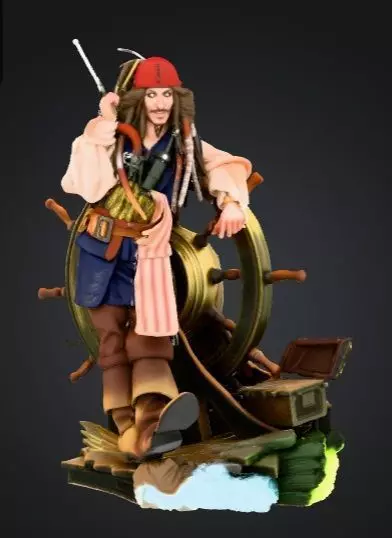 Bring me that horizon!" Capture the spirit of the legendary pirate captain with this highly detailed 3D printable statue. This model depicts the iconic character leaning against a classic ship's wheel, complete with his signature dreadlocks, red bandana, and pirate attire. It is a perfect centerpiece for movie fans and collectors.