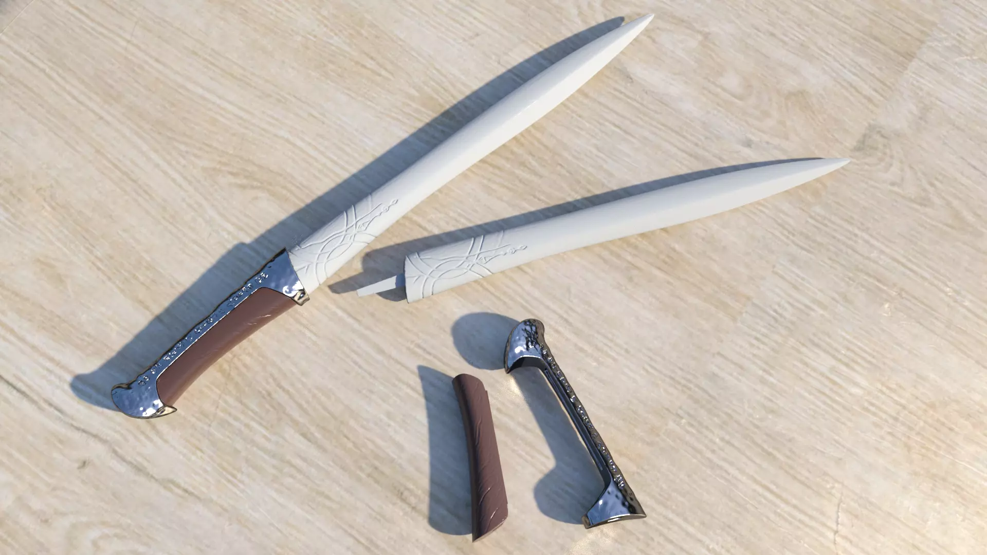 Crysknife from the movie Dune 2021. Used by Paul Atreides / Muad'dib (Timothée Chalamet ). A crysknife blade is made from a tooth of a dead sandworm of Arrakis. Model includes the Nurbs version and the texturized version of all parts if you want to add your own texture or inscriptions. Parts are separeted for easy printing.DIM: 448.5 x 28 x 39 (mm)