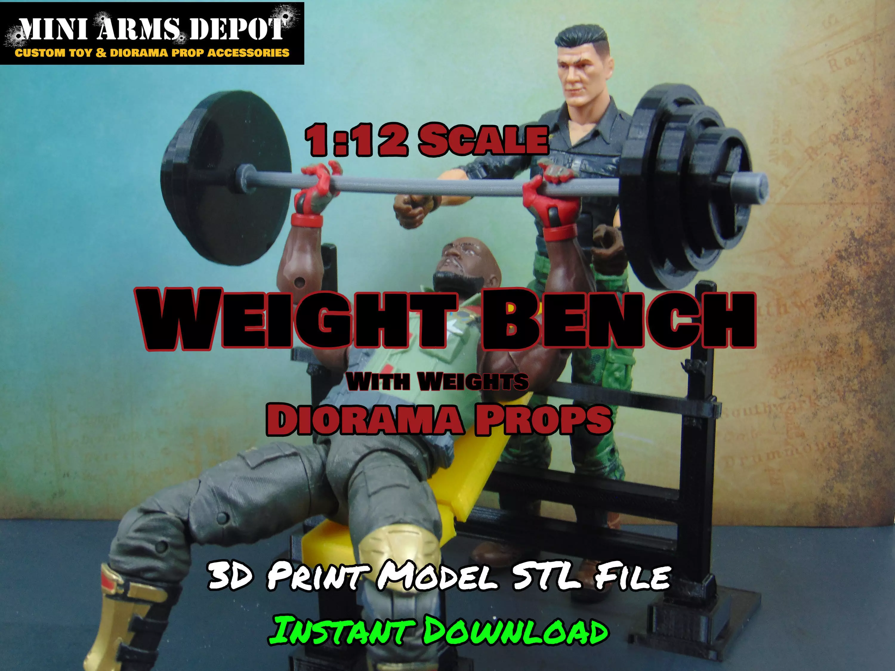 Print your own custom 1:12 scale Gym Weight Bench Press diorama prop accessory, and add some really cool realistic effect to your diorama.