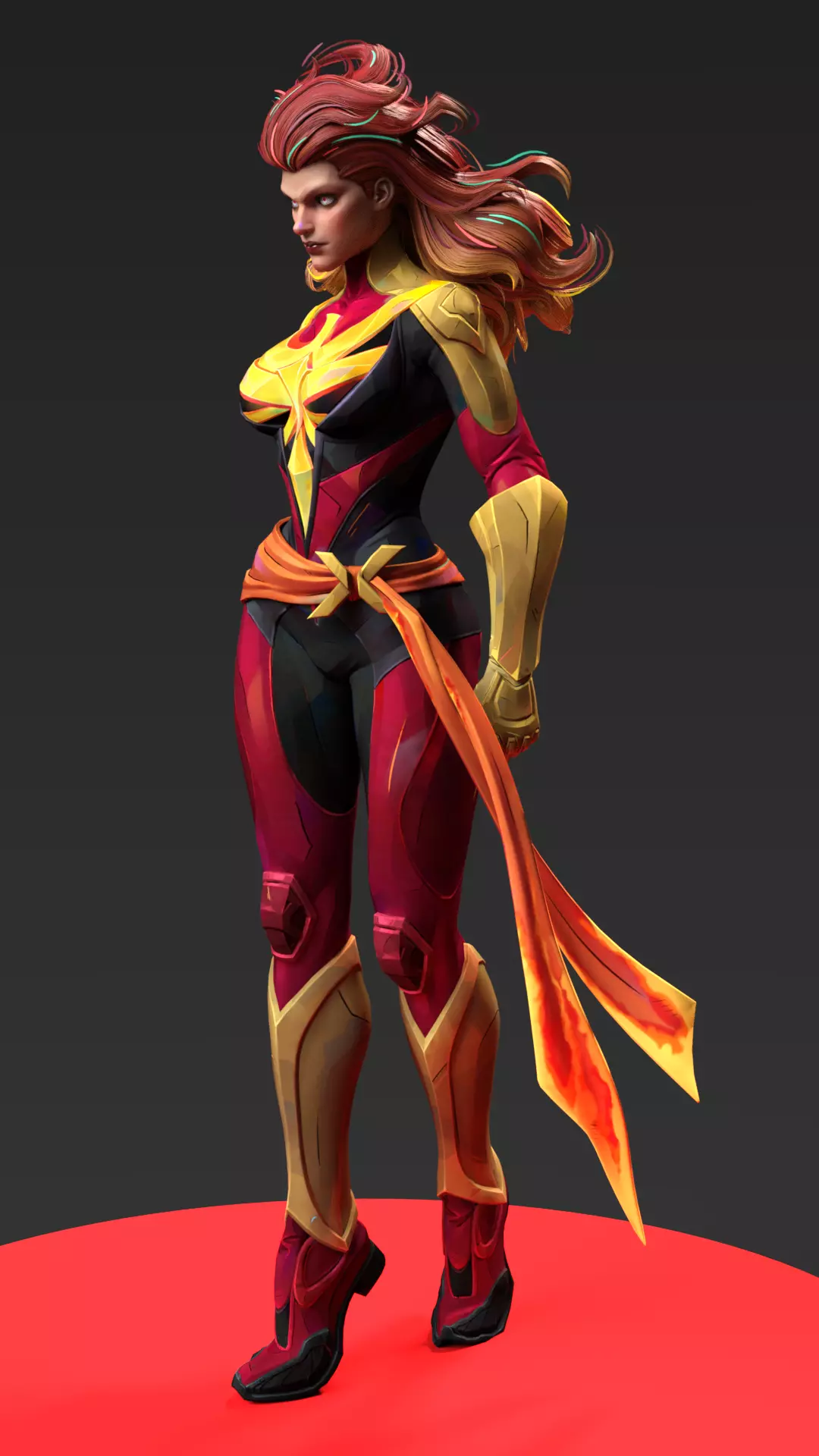 A stylized and dynamic 3D model of Phoenix (Jean Grey) from Marvel, featuring a suit design that merges her classic Dark Phoenix uniform with modern armor elements. The model has a strong focus on movement and energy, with the hair and sash sculpted to appear agitated by a cosmic force.