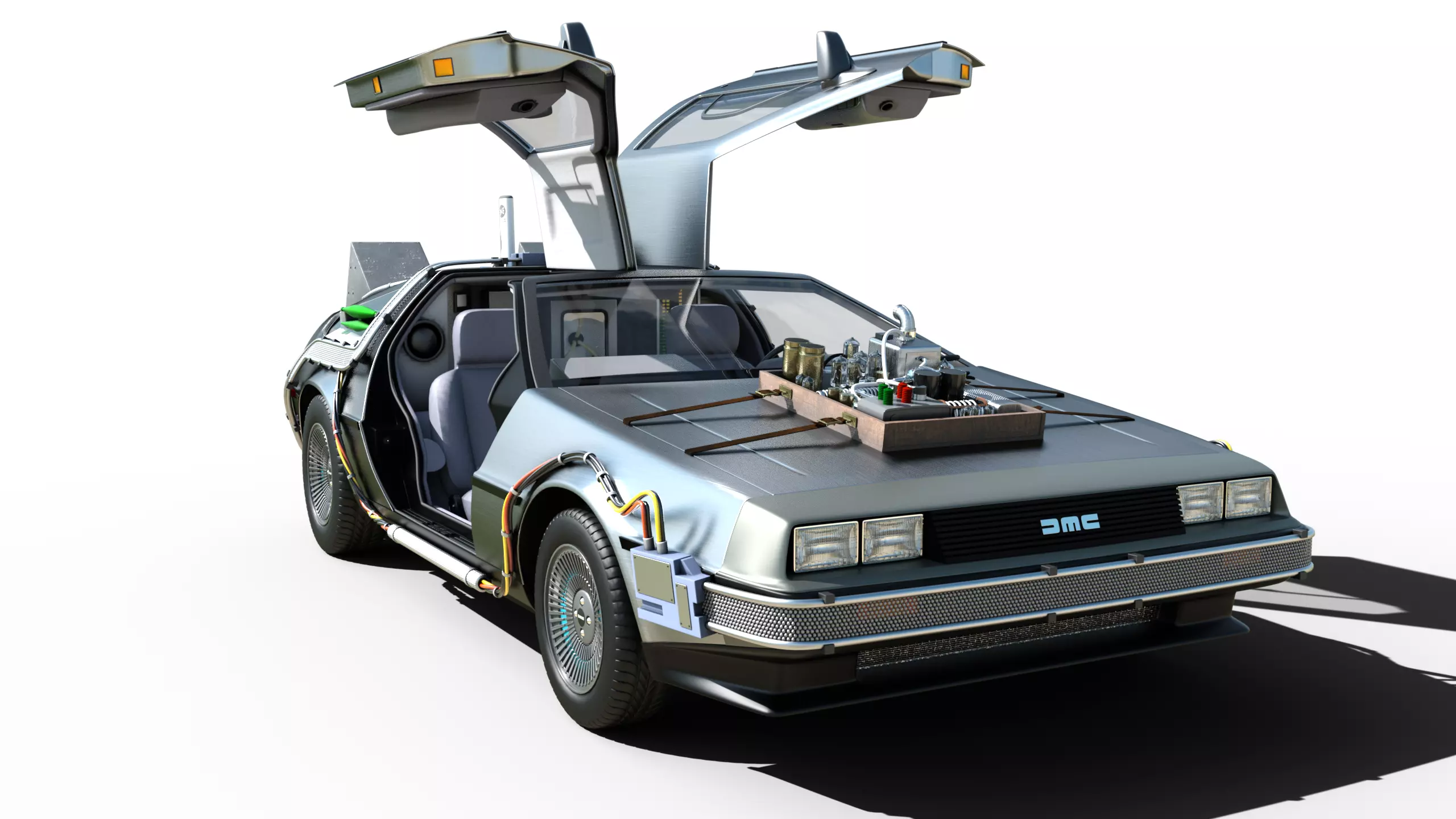 An impressive, hyper-realistic 3D render of the iconic DeLorean DMC-12 modified by Dr. Emmett Brown to become the time machine from the Back to the Future trilogy.
